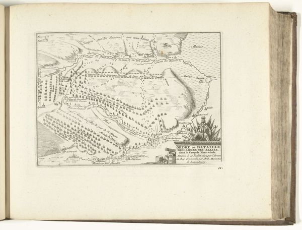 Curator: Here we have "Kaart van de slag bij Landen, 1693," or "Map of the Battle of Landen, 1693." This print, etched in ink by an anonymous artist, depicts the Allied army’s order of battle. It’s currently held here at the Rijksmuseum. What's your first take? Editor: Chaos! At first glance, it looks like ants swarming all over a picnic blanket. It has a fascinating density, doesn't it? Almost overwhelming, as though trying to convey the sheer number of individuals involved in a single historical moment. Curator: Precisely. What's remarkable about prints like these is how they translate a complex event into something comprehensible for a broader audience. Prior to mass media, visual representations were key to shaping public understanding of conflicts. Notice the Baroque style and the line work that provide structure to the image. Editor: Definitely structured. And almost... cute? In a strange way. These tiny regimented formations remind me of dollhouse soldiers arranged on a tabletop. Except, of course, the reality behind this game-like arrangement was devastating. Curator: Yes, this illustrates a key tension in historical representation. Maps like this aim to document the battle—in a way, offering some kind of "objective" truth, when, really, the depiction serves a specific agenda or point of view. The act of mapping, even the aesthetic of the rendering, can influence how people understand power and conflict. Editor: That's what I find so striking about this work. It's both aesthetically pleasing with those delicate lines and utterly chilling when you contemplate the immense human cost that underlies such tidy formations. You begin to understand the scale and coordination required in warfare. Curator: Exactly. In its own way, the piece embodies a kind of spectacle, aestheticizing a moment in history, transforming the real-world impact of political upheaval and violence into an intriguing piece of craftsmanship. Editor: Makes you wonder who originally encountered this image and how it was received. I’m still struck by the visual impact of so many lives organized on a single sheet. It's strangely moving, actually, like observing the faint echo of a shout. Curator: Indeed. This map compels us to remember, analyze, and ultimately to question the narratives around historical moments and the media by which such events were witnessed.