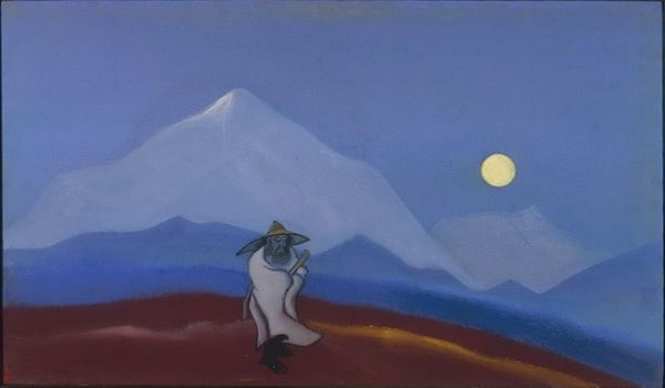 Nicholas Roerich painted 'Lonely Stranger,' sometime in his career, with what looks like tempera or gouache on board. The colours feel symbolic, the strong yellow sky, the shifting blues of the mountains, with the lone figure centre stage. Roerich isn’t trying to trick us with fancy perspective, instead we get these layers of flat colour building a landscape of the mind, perhaps. Look how the mountains fade into one another, they’re not solid, more like thoughts or memories. The surface has a slight texture, but it's mostly smooth, making the colours pop even more. What I find interesting is the mix of precision and looseness; the horizon is a sharp line, but the mountains have a softer, feathered quality. This contrast makes me think about how we try to define things, but life is always a bit blurry around the edges. It reminds me a little of Milton Avery's simplified forms and colour choices. Just like Avery, Roerich finds a way to turn simple shapes into something deeply evocative.