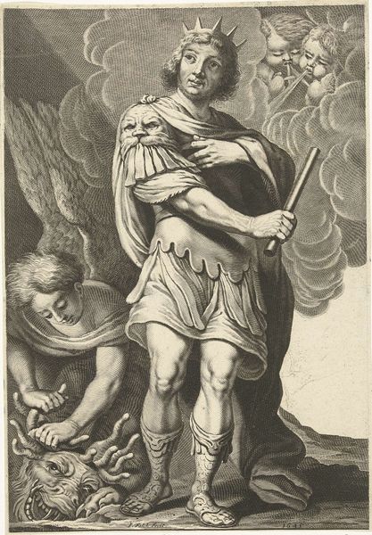 Curator: This engraving, created in 1645 by Jeremias Falck, depicts the destruction of the Assyrian empire of Sennacherib. It's a striking example of Baroque printmaking, isn't it? Editor: Absolutely, my initial reaction is one of intense drama and almost chaotic movement. There’s a clear sense of impending doom emanating from the central figure and the destruction alluded to in the background. What specific aspects of its making draw your attention? Curator: Well, for me, it's the technique itself. The lines, the density of the hatching—you can almost feel the labor involved in creating this scene. Look closely at how the printmaker modulates the light and shadow just by the sheer physical act of carving these lines into a metal plate and using a press to produce the image. What of the historical context catches your attention? Editor: The narrative—specifically, the fall of empires. We're looking at a visual representation that could be tied to post-colonial interpretations and histories, where power imbalances, cultural erasures, and the cyclical nature of empires rising and falling become clear. How does this print function within broader narratives of identity, conflict, and historical trauma? The print alludes to an old Assyrian power structure; what replaced it and at whose expense? Curator: That’s insightful. Focusing on materials, this image would have circulated widely, democratizing the Biblical narrative and historical themes to a public beyond the wealthy elite. These aren’t unique canvases crafted for a single patron but reproducible images meant to disseminate information widely, serving economic functions through its accessibility, and influencing opinions regarding this Biblical story. Editor: Yes, thinking about dissemination broadens the cultural impact, bringing up issues about social messaging and possibly the artist's position. Do you believe Falck's intent was didactic or merely descriptive? Also, in what ways could contemporary audiences engage with this historical destruction? It also begs questions about the role of artists and intellectuals within broader power systems. Curator: I’m particularly interested in considering the impact of mass-produced imagery on individual and collective consciousness. We could ask about the relationship between craft production, historical storytelling, and the perpetuation of particular values and power structures through accessible artwork. The line quality itself has an almost illustrative function to the biblical narrative; perhaps he saw himself as just the medium through which this was conveyed. Editor: Exactly. And by recognizing such works as reflections of complex political and historical undercurrents, we may uncover rich opportunities to foster dialog that centers overlooked perspectives about the cyclical nature of history. It makes me wonder if this Biblical story was about power structures more than morality; empires eventually decay into their constituent resources. Curator: It certainly seems so! By examining both the physical object and its historical placement, the social and historical factors during its production start coming into focus, which encourages us to appreciate art from fresh, critical perspectives. Editor: Agreed; a material examination allows us to deconstruct how artworks have, throughout time, expressed, questioned, and sometimes perpetuated ideologies embedded deeply within broader societal dialogues. Thank you.