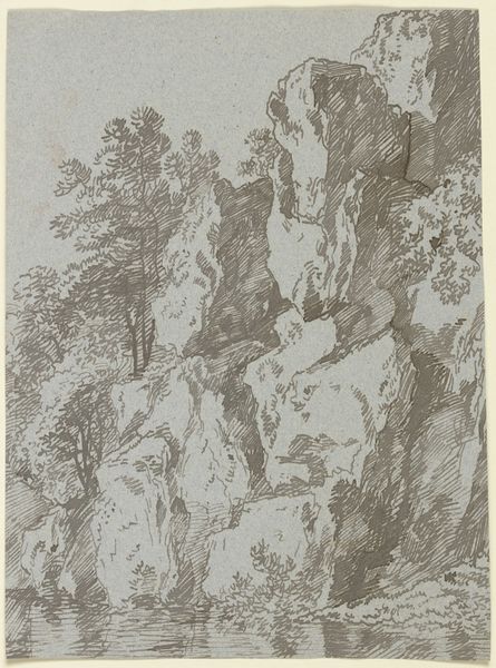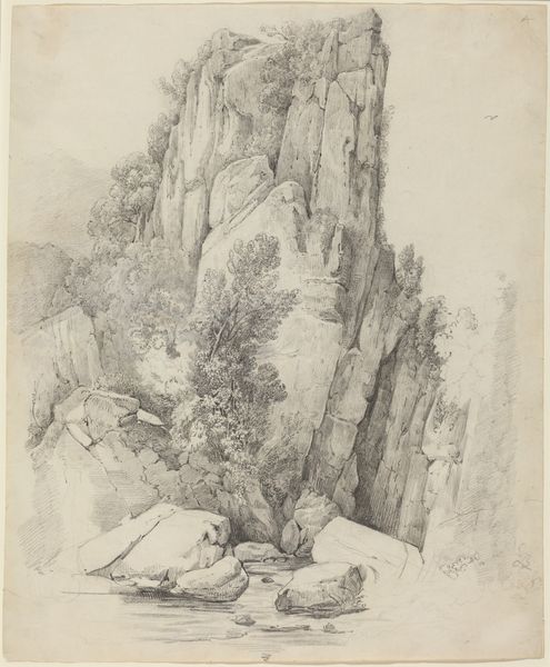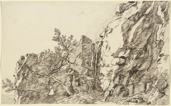 Editor: Here we have "Felsbrocken an einem grasbewachsenen Hang" which roughly translates to "Boulder on a grassy slope" by Franz Kobell, an etching rendered in ink. I’m struck by the contrast between the densely etched boulder and the more delicate grasses. What’s your take on it? Curator: Well, notice how the density of line is almost solely what constructs volume and texture? Kobell's labour with the etching needle—the sheer physical act of mark-making—becomes the subject itself, a study of materiality. The social context is interesting: landscape art becoming popular and, at the same time, the rise of industrialized printmaking. Was this made for aesthetic appreciation or for a burgeoning print market? Editor: So you’re saying that its value is tied to the labor and potential mass consumption implied by the printmaking process? It also seems like the materials really dictated how the image would be constructed... the density is only achieved by so many repetitive lines, for example. Curator: Precisely. Think about how landscape paintings often romanticized nature. Here, however, we have an exploration of process, revealing the artificiality inherent in representation. What is labor without landscape, or landscape without the manual labor involved in its creation as an art object? Also, are we even meant to see beauty, or just understand that stone as object is constructed from nothing but a repeated process? Editor: That’s a perspective shift! So instead of pure landscape, it's commenting on its own manufactured existence and consumption... that changes everything. Curator: Exactly! What have you discovered that's interesting, based on this approach? Editor: Considering how the artist translated the natural landscape into a manufactured item gives the work a completely new depth. I’ll never look at landscape etchings the same way!