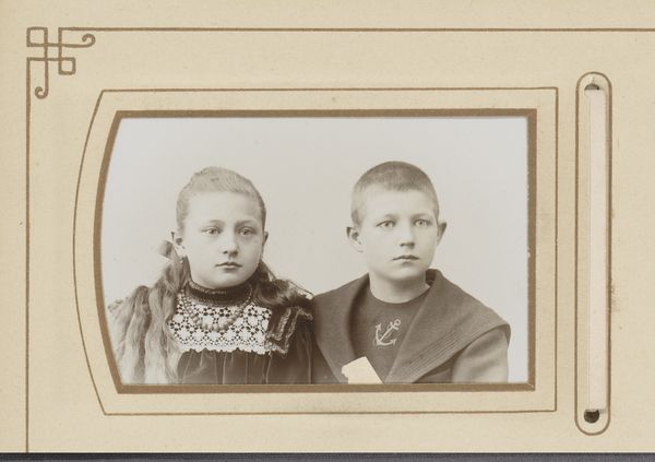 Curator: Here we have "Portret van twee kinderen," a photographic print dating back to around 1890 by Henri Paul Emile de la Roche Busé. Editor: It has a dreamlike quality. Their stares feel weighty, like they hold knowledge beyond their years, almost like miniature adults trapped in childhood. Curator: That feeling, I suspect, has a lot to do with photographic practices of the late 19th century. Sitters were asked to hold incredibly still for long exposure times, often resulting in a serious, almost vacant expression. Children were expected to behave in a certain manner, still a recent innovation since views of childhood as uniquely innocent, rather than small, not-yet-productive adults, began solidifying only in the 18th century. Editor: I notice they are dressed almost identically, these formal, naval-style outfits suggesting a shared social status. Curator: Yes, those outfits speak to the rise of a middle class with disposable income, carefully constructed visual cues to convey respectability. Group portraits, especially of children, became fashionable among families who could afford professional photography. Think about how the circulation of these images shaped broader cultural perceptions of childhood and family. These types of images also begin circulating, being viewed across a nation. The idea of what it meant to be Dutch shifted over time, to being viewed as more than merely regional identity, even expanding definitions of childhood, innocence, and national family ideals. Editor: It is striking how much their expressions remain relevant, those gazes speak across the years. I am wondering, who were they and how might they see themselves represented today, within our understanding of visual representation? I am interested in understanding, are the notions of childhood they might possess akin to how we conceive of children today? What would they feel about us looking back? Curator: I suppose, the historical layers and contextual readings remind us that while their emotions might resonate, we must tread carefully when imposing modern ideas. They participated in specific socio-political and aesthetic practices, it is a useful window into the shaping of familial identity, ideas that continue to hold influence in present visual representations. Editor: Definitely, a visual record like this provides such insight when carefully investigated. Curator: Indeed. Every photographic decision and historical factor allows us new awareness of past attitudes.