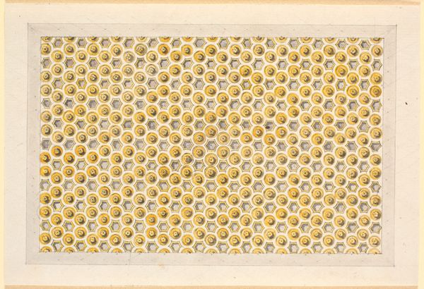 Curator: Take a look at this ceiling design from Nicolai Abildgaard, dating back to the late 18th, early 19th century. It’s titled "Udkast til loft med sekskantede kassetter og rosetter i gult og violet," or "Sketch for a Ceiling with Hexagonal Panels and Rosettes in Yellow and Violet." You'll notice it uses tempera on paper. Editor: Wow, what a find! It's incredibly ornate and gives me a playful yet formal vibe. I’m thinking grand salon… or maybe even the parlor of a very important bee! Curator: Considering Abildgaard's firm grasp of Neoclassical principles, the layout adheres to the formal language through geometric design. We also need to factor in how creating artwork involves social relations between the patron requesting such design. It offers insights into their economic capital. Editor: Right, because someone has to *pay* for all those rosettes! But seriously, there's something so human about the precision here, even though it's aiming for classical perfection. What labor went into this piece... imagining those hexagons, the tiny flower in the center of each one—did he consider mass production, I wonder, as it echoes a textile design with implied repetition? Curator: Likely he intended for the design to be expanded according to the room’s dimensions—to manufacture ornamentation is always the tension when addressing labor. Editor: I love that. And what about those little diamonds nestled in the corners? They're almost like secret gems scattered across the sky! It’s all carefully composed but somehow retains this airy, imaginative quality. Curator: The use of tempera would suggest consideration for fresco transfer, but looking closely at the visible gridlines, it speaks more to the intellectual planning and preparation. These patterns provide crucial access points when thinking of design from that period. Editor: It definitely shows the rigor required for such an endeavor, yet for all its meticulous detail, I can't help but appreciate its whimsical touch! A testament of artistry with social implications, wouldn't you agree? Curator: I concur. The combination of artistic and labor implications are a point of interest, providing great value to a more intimate appreciation for the work in its historical moment.