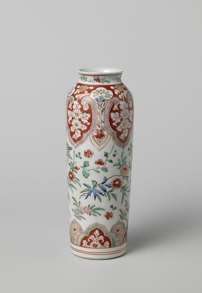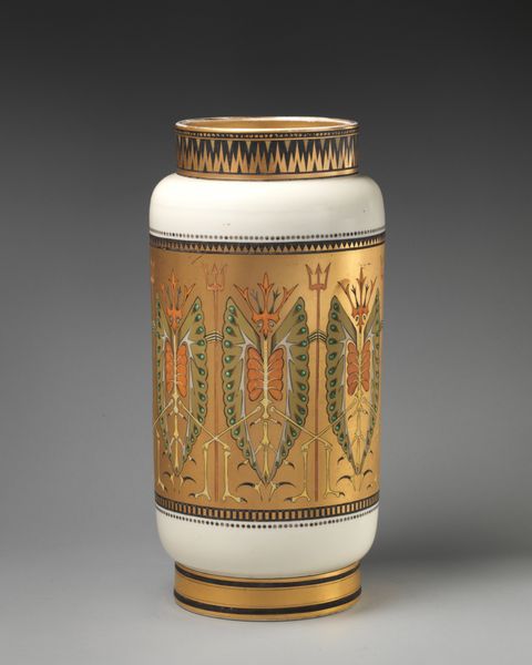 Editor: Here we have Minton's Cuboid Vase from around 1870, crafted from ceramic and porcelain. I am struck by the juxtaposition of its rigid geometric form with the delicate floral motifs. What can you tell me about it? Curator: This vase provides a fascinating example of the Arts and Crafts movement's engagement with industrial production. Consider the material – porcelain, typically associated with luxury and fine art. But here, it’s shaped into a mass-producible cuboid form and decorated with repetitive geometric patterns. Editor: So, it's a commentary on industrialization, perhaps? Curator: Precisely. The hand-painted floral details, though seemingly traditional, are constrained within a rigid grid. It raises questions about the role of the artisan in a mechanized world. What kind of labor was involved? Were these vases produced in a factory setting? We have to consider the context and social framework. Editor: That makes me think about the division of labor. Were different craftspeople responsible for different aspects of the vase? Curator: It’s likely. The design and application of geometric forms may have been a separate, specialized process from the painting of floral elements. Investigating factory records would offer insight. The value we place on “fine art” versus “craft” is challenged when we examine these modes of production, and also the distribution and the market, in that epoch. Editor: So by examining the material processes, we can see how social hierarchies played out even in decorative objects? Curator: Absolutely. This vase embodies tensions within Victorian society. It speaks to the aspirations of the Arts and Crafts movement and their struggle with how best to improve industrial design and manufacture and with the systems of commerce within a modern market. Editor: That's given me a whole new way to look at decorative art. I would not have seen so much by simply admiring its apparent "beauty". Curator: Exactly! It's by tracing its production, distribution and labor implications, that we understand an art's purpose.