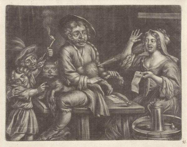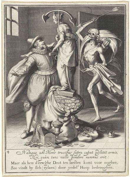 This allegorical print, titled "Jeugd en ouderdom," or "Youth and Old Age" in English, is rendered with fine lines and intricate crosshatching, typical of engravings. The contrast between the figures is striking. On one side, the youthful figure is adorned with a flamboyant hat and tunic; he gestures animatedly towards the cherubic figure riding a goat, symbolizing youthful folly. The composition reflects vitality with upward diagonals and lively interaction. Conversely, old age is represented as a seated, cloaked man weighed down by time and worldly goods shown at his feet. The artist uses the formal elements of line and form to visually articulate the dichotomy between the vigor of youth and the resignation of old age. This division serves as a commentary on the inevitable passage of time, suggesting a meditation on the ephemeral nature of human existence. The engraving employs semiotic contrasts to invite viewers to reflect on their own lives and mortality, illustrating an artistic exploration of time's passage through symbolic representation.