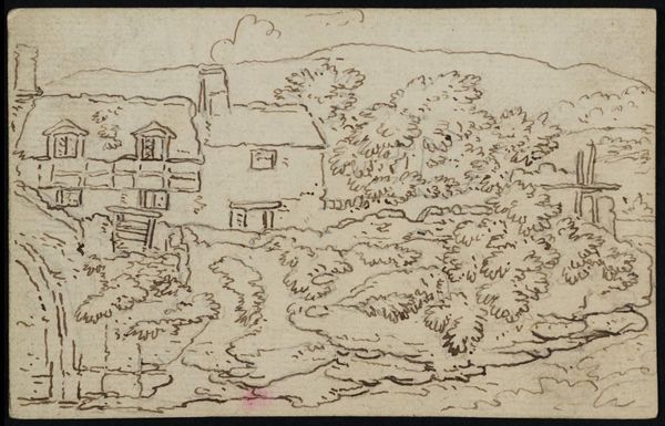 Editor: This drawing, "Houses and Mountains Seen from a Bridge near Llangollen" by Philip James De Loutherbourg, captures a quaint scene with delicate lines. I’m curious, what kind of societal role did landscapes like this play back then? Curator: Considering the late 18th-century context, it’s interesting to note the rise of landscape as a patriotic symbol. Do you think this drawing idealizes rural life, subtly reinforcing a particular vision of British identity? Editor: Perhaps. It feels very romantic, almost staged. Curator: Exactly. The picturesque movement valued scenes like these. De Loutherbourg was a master of stage design, so it's no surprise that even his landscapes feel composed for an audience. It makes you wonder about authenticity versus representation. Editor: I see what you mean. It's less about capturing reality and more about crafting a desirable image. Curator: Precisely. And that image had political implications, shaping perceptions of national pride and the value of the land. Editor: That's a fascinating perspective; it changes how I see the artwork entirely. Thanks for illuminating the historical context!