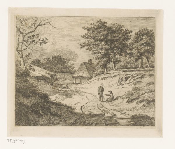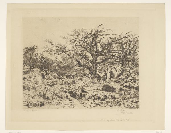 Curator: Let’s turn our attention to Joseph Edouard Van Looy’s etching, "Wintergezicht met figuur met takkenbos," dating from between 1881 and 1912. What strikes you most about this piece? Editor: The sheer grit of it, actually. You can almost feel the cold radiating off the paper. The textures are rough; that scratchy line work communicates the harshness of the winter landscape in a very tactile way. Curator: Absolutely. Van Looy presents a realistic, almost bleak, depiction of rural life. Look at the solitary figure carrying a bundle of branches – a genre scene that speaks to the everyday struggle of people during the winter months. Editor: It makes me think about the physical labor involved in simply surviving in those conditions. Etching itself is a labor-intensive process, mirroring the work being depicted. The artist manipulating metal to represent someone gathering firewood – it creates a sort of material echo. Curator: I agree. And consider the social implications; this print likely reached a middle-class audience eager to consume images of picturesque rural life while remaining detached from its realities. The "realism" here is mediated by class and consumption. Editor: It's interesting you say that. The choice of etching seems deliberate. The relatively affordable medium allowed for broader distribution, and the almost mechanical reproducibility created accessibility, fitting into that narrative of consumption you mention. But then, there’s the artistry, the decisions made in line and tone… Curator: Of course. Van Looy was consciously participating in and reacting to the artistic trends of his time. The print participates in the broader popularity of landscape imagery and genre painting. We see an interplay between artistic intention, audience expectation, and market demands. Editor: Thinking about the figure – you can sense their weight, their trudging labor. Van Looy clearly wants to portray a respect, possibly a sense of intimacy, with those laboring people. Curator: So, we have an artwork, in print form, allowing those in more urban settings insight into their rural counterpart and all their struggles? It speaks to an interesting narrative of observation that has the ability to spark a more socially aware response for a lot of individuals. Editor: Yes, the artwork brings forward thoughts and sentiments. The rough materiality serves the historical and social sensitivity Van Looy's has portrayed.