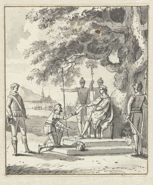 Jacob Folkema made this print, "Dame en twee heren in gesprek," using etching. It shows a lady engaged in conversation with two gentlemen, all dressed in the fashion of the 18th century, likely in the Netherlands. The image appears as an illustration within a larger publication. Such scenes were popular in the art of the period, reflecting the social customs and values of the time. The presence of a carriage and a grand building in the background suggests an upper-class setting, one where polite conversation and courtship were important aspects of social life. Prints like this, widely distributed and collected, reveal much about the culture of the 18th century. Examining related texts, fashion plates, and conduct books can offer a deeper understanding of the social rituals depicted. Art is contingent on such social and institutional contexts.