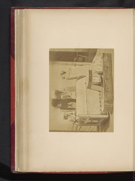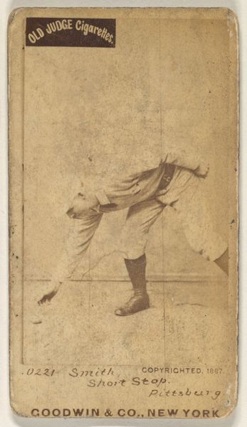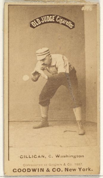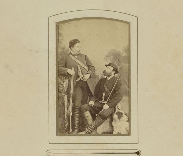 This photographic print by A. Eichenwald captures Francisco and António d'Andrade in a dramatic duel from the opera Carmen. It's made using the albumen process, which involves coating paper with egg white and silver nitrate, creating a glossy surface for detailed images. The albumen print was a product of the Victorian era's fascination with reproducibility and the burgeoning culture of celebrity. These prints were often mass-produced, catering to a public eager to consume images of famous figures. In this context, photography became a powerful tool for disseminating images of performers, turning opera singers into household names. This particular print also reveals the artistry involved in creating a staged scene, with the backdrop hinting at the theatrical nature of the opera. It bridges the gap between the ephemeral experience of live performance and the permanence of a photographic object. The image’s value lies not only in its documentary quality but also in its engagement with the popular culture of its time, reflecting the intersection of art, entertainment, and commercial production.