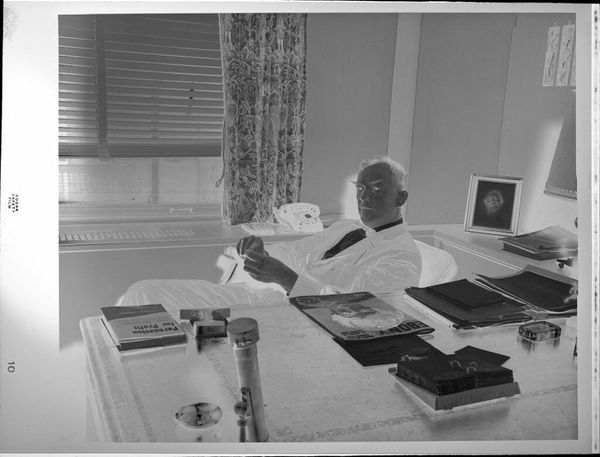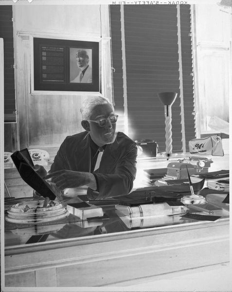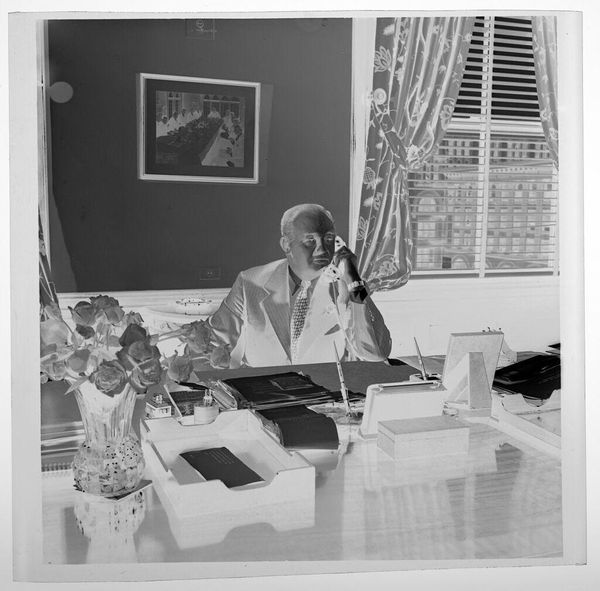 Editor: This silver gelatin print by Peter James Studio, simply titled "Untitled (man behind desk)," presents a rather serious and contemplative scene. What's your take on the story it's trying to tell, or perhaps not tell? Curator: It's a wonderfully evocative image, isn't it? To me, the inverted tones give it a dreamlike, almost spectral quality. Notice how the objects on the desk—the typewriter, the phones—speak to a bygone era. Do you think that the artist wanted to remind us of something? It could be a memento mori for the fast pace of work. Editor: That’s an interesting perspective. I hadn't considered the objects as symbolic of a fading time, but now it really makes you wonder. Thanks! Curator: My pleasure. Art whispers if we listen closely.