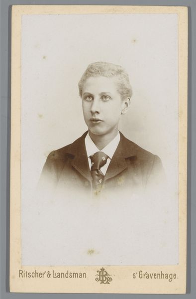 Curator: Looking at this sepia-toned photograph, titled "Portret van een jongen" - that's "Portrait of a Boy" – estimated from 1860 to 1900, my immediate feeling is one of quiet introspection. Editor: The surface sheen from this kind of albumen print can be remarkably alluring; look how it's captured here, holding so much material nuance despite its small size. Curator: Yes, photography during this period held complex socio-political connotations regarding representation. Think about who was granted the opportunity to be photographed and who was systemically excluded. A young man of likely privilege and, undoubtedly, the politics of class come to mind immediately. Editor: It also makes me wonder about the labor behind its production. We can think about the labor invested in preparing the photographic plates and chemicals used in capturing the image, considering their relative value in this historical moment. Curator: Absolutely. We might ask who gets to construct and own the visual narrative? And, to that end, this specific kind of studio portrait was used, for whom and by whom? Editor: Right, it was largely accessible only to the upper and emerging middle classes. To that point, it shows in his presentation - the cut of his suit, even the styled hair. It seems the sitter would likely consume this in order to signify his status and taste. Curator: It underscores the cultural values assigned to appearance and status, really revealing hierarchies around gender as well. The restrained pose, his serious expression, what story does it intend to convey about masculinity at the time? Editor: Agreed, understanding how photography evolved as both art and a craft is crucial here. How we memorialize ourselves is telling and often serves particular purposes. Curator: Reflecting on this portrait allows us to see how notions of gender, class and social status were embedded within material practices like portraiture. Editor: Yes, the way photography shaped perceptions through its own production gives us much to examine from a material standpoint.