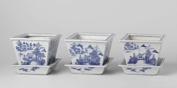 This square jardinière and stand with river landscapes, was made with tin-glazed earthenware, and features hand-painted decorations. The material itself, earthenware, has a long and global history. Achieving its characteristic blue and white required careful sourcing of cobalt for the pigment, precise application, and high-temperature firing. Notice how the square form of the jardinière and stand have straight sides. This uniformity requires skillful use of molds and hand-finishing to eliminate imperfections. The river landscape decoration, executed with brushstrokes, evokes a sense of serenity and harmony with nature. These hand-painted scenes were often produced in workshops, where skilled artisans worked to meet the growing demand for decorative objects. The labor-intensive processes demonstrate the value placed on craftsmanship and artistic expression. By appreciating the materials, techniques, and cultural context, we gain a deeper understanding of the significance of this jardinière and stand, transcending the traditional boundaries between art and craft.