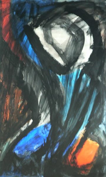 Editor: This is Eugene Brands' "Fabeldier," painted in 1969, likely using oil on canvas. It has a primal, almost cave painting quality to it. What do you see in this piece, beyond the immediately striking composition? Curator: Ah, yes, “Fabeldier,” a 'mythical beast' indeed. To me, this isn't just a painting; it's a glimpse into the playful mind of the artist. Notice the bold use of colour, the fluid lines - it's pure, unadulterated expression! Do you get a sense of movement? The brushstrokes almost dance across the canvas, creating this feeling of something being born or transforming before our very eyes. I almost feel I've walked into one of his dreams; do you see what I mean? Editor: Absolutely, there’s an energy that leaps out. I see the movement you're describing and a sense of raw, unbridled imagination at work, like he's letting his subconscious run wild, unrestrained, like child's painting. It evokes primal imagery, the animal form. Did Brands associate this period in his practice with those subconscious motivations? Curator: He definitely did, like a jazz musician improvising. I mean, Brands was a part of the CoBrA group, wasn’t he? The CoBrA artists aimed to tap into that wellspring of primal creativity and almost pre-rational experience, you know? Look closely at the juxtaposition of black, white and red... what does that make you feel? It creates a certain visual tension, almost opposing forces. Editor: It feels like a struggle, maybe a balance between light and shadow, darkness and vibrancy, definitely unsettling, almost spiritual in the broadest sense. What did he hope viewers would take away from his approach, from tapping into such a raw, personal space? Curator: I think that Brands would urge viewers to feel, not to overthink. This isn’t about intellectualising a concept, this is an immediate call, almost visceral, to one's creative heart. It's pure Brandsian magic! I learn more each time I study his work, always fresh, honest and full of childish joy. Editor: That's true, it certainly invites a childlike view of creation, full of the energy and unformed imagination. I’ll remember that freedom when viewing expressionist work from now on!