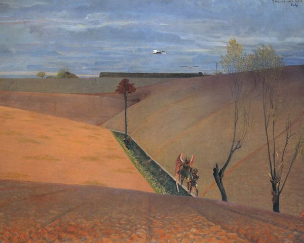 Curator: Konstantinos Maleas painted "Lavrio Landscape" around 1920, using watercolor. It's an excellent example of his approach to modern landscape painting. Editor: Wow, it’s so serene, almost dreamlike. The blues of the water really pop against the warm, golden grasses. Gives you a feeling of lazy summer afternoons. Curator: Yes, note the formal interplay between the flatness of the picture plane and the illusion of depth created by the arrangement of forms. The rhythmic brushstrokes in the foreground also direct the viewer's eye, serving a structural purpose. Editor: Absolutely, I can see that. But it’s also how the colors melt into each other that grabs me. That blurred boundary between the sea and shore... it feels like memory, like trying to hold onto a perfect moment that’s already slipping away. The lone tree shapes are very interesting also. They punctuate the land almost as compositional markers. Curator: Maleas demonstrates a sophisticated understanding of modernist principles by reducing the landscape to its essential components: color, light, and form. The lack of intricate detail forces the viewer to engage with the painting on a more abstract level. The subtle layering is striking, wouldn’t you say? Editor: Without a doubt. He's not just showing us the landscape, he’s making us feel it, too. And that stark water—it’s more than just color. It's evocative. The muted tonality really gives it a feeling of longing... Curator: Indeed, that resonates, particularly if you consider the historical context, and how landscape painting became a vehicle for national identity around that time. The scene might appear pastoral but can suggest something far more weighty about belonging. Editor: Hmm, yes. Something that goes beyond mere scenic beauty. In any event, I leave this painting with a smile, feeling that special glow. Curator: A perceptive reading! Indeed, through the simplification of form and delicate rendering of light, Maleas captures a moment of quiet contemplation that elevates this work beyond a mere representational exercise.