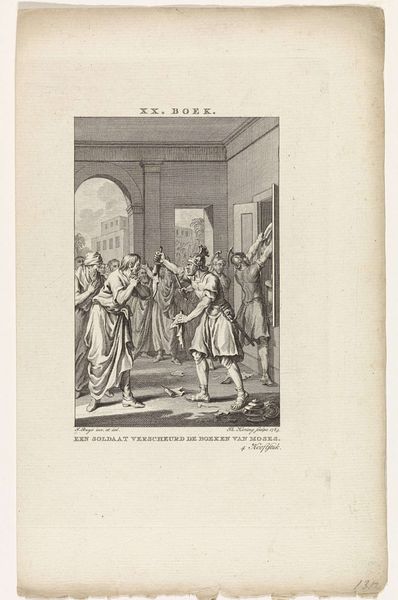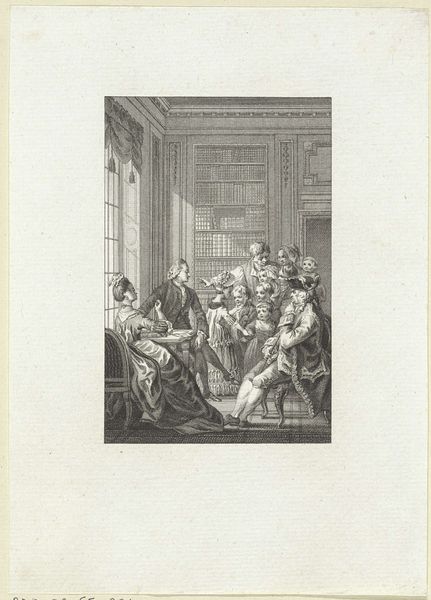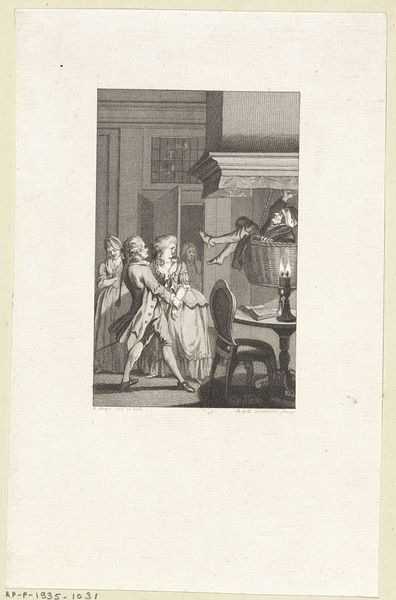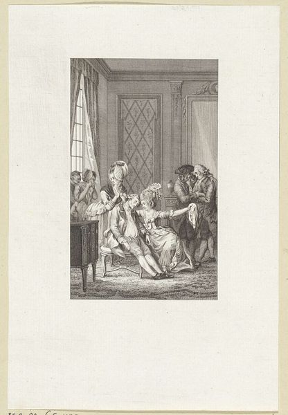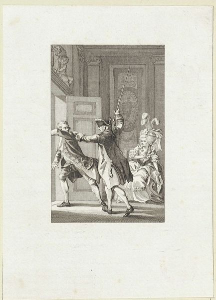 Curator: This is "Man met een dolk en flauwgevallen vrouw in een vertrek" from 1776 by Reinier Vinkeles, an engraving—essentially lines etched into a plate and then printed. It resides here at the Rijksmuseum. What leaps out at you? Editor: Pure melodrama. The theatricality of it, the fainting, the dramatic pose with the dagger… it feels lifted straight from a stage play. The room, the characters are meticulously rendered with great attention to light and shadows and so you get this wonderful, delicate play of grays, almost monochromatic. Curator: Absolutely. Vinkeles excelled at narrative. You see it everywhere – that heightened tension, the explicit storytelling, and his devotion to genre painting with its narratives steeped in high drama, reflecting society’s tastes. But tell me, what does the materiality suggest to you? An engraving, printed...it evokes production, doesn’t it? Editor: Mass production, certainly, even if it's still relatively artisanal. It hints at wider distribution. Not just a unique, singular object but a designed thing replicated and sold, entering the homes of a burgeoning middle class wanting a bit of high culture but needing it portable and accessible. And, I find that map on the back to be fascinating…what does that signify? Curator: Isn't it wonderful? Vinkeles often incorporated cartographic elements. Perhaps an attempt to portray reason and learning collapsing in the face of passion—this ‘mapemonds plan’ in conflict with uncontrolled emotion. Or simply just more worldliness and intellect present. Editor: It does feel contradictory. The cold calculation of maps alongside such raw, overblown emotion, printed using industrial means to portray such domestic theatrics...It underlines how carefully constructed these narratives are; almost factory made. The 'drama' has been processed and designed before even seeing it. Curator: Yes, a commercial package! Still, for all the material calculation, it whispers secrets about its time. And, well, there are still all those intricate etched lines, evidence of artistry amid the mercantile world...it invites an intimate gaze too, somehow, I feel... Editor: Perhaps that paradox is the whole point: industry creates an art experience of the world, or at least, how they would wish you would see it! Alright, I have now lost my bearings, this print really messes with me!
