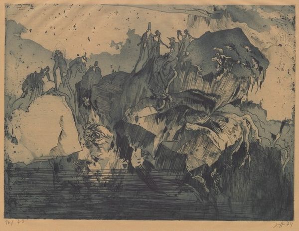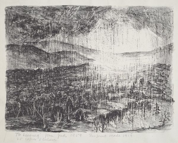 Curator: "Angry Sky," made in 1959, is a striking print by Gabor Peterdi, an etching that immediately pulls you into a tumultuous landscape. Editor: Oh, absolutely turbulent. The density of lines! It’s as if Peterdi etched his raw, visceral energy directly onto the plate. The sky really does feel angry. I see rain, or perhaps some other form of chaotic weather beating down on everything below. Curator: He certainly captures nature's more ferocious side. Peterdi emigrated to the US in the 1930s, and his work often explores themes of displacement and the power of nature. One might argue that these prints were a kind of reaction against human violence. Editor: Right. It seems to say something bigger too – you know, about the precariousness of existence, like humanity itself is on the verge of being swallowed up by the landscape's ferocity. Curator: Exactly! Note how the abstract shapes are vaguely suggestive, we get hints of familiar things without clarity, evoking this kind of instability. Even its graphic nature and strong contrast heightens the emotional tenor of it all. It is quite the evocative landscape, given its complete abstraction! Editor: Its monochrome is perfect for the mood – you get lost in all shades of brooding gray! It creates such depth too. I mean the lack of bright colors intensifies that feeling of foreboding, that the sky’s anger has leeched all other expression. Even light! Curator: Yes, and that texture he achieves is extraordinary given that he’s working with lines, rather than planes of colour. He creates such volume and dynamism. Editor: Looking at the time in which it was made, it's difficult not to consider its relationship to the cultural politics surrounding Abstract Expressionism, where gestural mark-making became almost an emblem of freedom in a cold war context. Perhaps there’s also something deeply individual about all those personal frenetic lines. Curator: A very potent point. “Angry Sky” remains resonant, prompting us to think about both environmental fragility and our place in it. It makes you consider those storms you've weathered—literally and metaphorically—doesn't it? Editor: Absolutely. Thanks, this was so evocative. I now know just how good, I have it. I'm leaving here thinking deeply about how human turmoil and landscape are, or perhaps can never truly be disentangled!