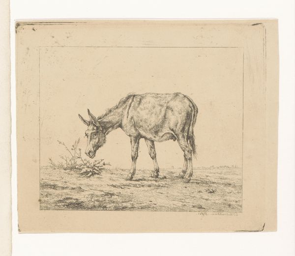Curator: Welcome to this detailed drawing, "Landscape with Cattle," crafted by Jean Louis Demarne sometime between 1818 and 1842, rendered delicately in pencil. Editor: It has this wonderfully placid, almost mournful atmosphere. The lone cow seems very much alone. Curator: Yes, consider how Demarne meticulously employs the pencil to define texture—the animal's form, the rough bark of the tree, and even the distant horizon are distinct. Notice the tree's prominent placement. How does its gnarled form guide your reading of the composition? Editor: To me, that solitary cow signifies so much about rural precarity. These pastoral scenes often mask the economic and social realities. This piece likely coincided with intense shifts in agricultural practices, with land ownership and animal labor deeply embroiled in sociopolitical conflicts. Was Demarne commenting on this tension, do you think? Curator: The visual language here is certainly grounded in Realism, prioritizing accurate depiction. However, the romantic treatment of light softens what might otherwise be harsh truths. Semiotically, the cow could represent not just agricultural life but also abundance. Editor: Or maybe the artist wants to draw attention to that exact idealization? Cows weren’t free from exploitation any more than farmers were spared by capitalism’s cruelty. Where is their freedom in this idyllic setting? Does their freedom exist? And that bare, broken-looking tree – could it represent death or, at the very least, deprivation? Curator: Well, perhaps the effectiveness of Demarne's realism is that it evokes such multilayered readings. The contrasting values alone – the sharp lines versus hazy backgrounds—make one pause. Editor: Absolutely. Artworks like this can either veil or unveil complex realities. Thanks for this nuanced reading. Curator: Likewise. Reflecting on the interplay of form and content certainly enriches our understanding.