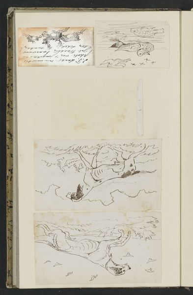 Curator: Here we have a drawing by Johannes Antonius Canta, "Haas, rennend hert en twee honden," created sometime between 1826 and 1888. It combines ink and watercolor on paper. Editor: It strikes me as rather disjointed, almost dreamlike in its arrangement. The animals are rendered with a stark simplicity. What do you make of the compositions? Curator: The use of line is intriguing, especially in the dogs. The artist uses economical strokes to capture form and motion. Notice, too, how the subtle watercolor washes create a sense of depth despite the limited color palette. Editor: I see a distinct echo of 19th-century hunting culture. The running deer and the dogs are positioned within the historical context of aristocratic leisure, of power dynamics acted out through pursuit. The landscape almost disappears, doesn't it? Reduced to providing a theater for this enactment. Curator: Perhaps, but observe how the minimal setting draws attention to the figuration. The arrangement calls to mind a semiotic structure, a play of signifiers: predator and prey, the tamed and the wild. Editor: I would push back on the neutrality of that 'play'. Aren’t these categories deeply ingrained with societal valuations? The romanticized hunter versus the vulnerable deer—a narrative laden with cultural significance around class and the natural order. Curator: While your interpretation is noted, analyzing the raw artistic structure is still valid. The rhythm of the chase, the implied lines connecting the animals...these compositional elements exist independent of their historical readings. Editor: I would argue such abstraction is a fallacy. The piece exists precisely *because* of these social factors; to disregard them is to lose sight of the driving force behind its creation. The economic and social conditions determined what kind of scenes were considered worthy subjects in the first place. Curator: Ultimately, our engagement reveals how multifaceted interpretation can be. Different theoretical frameworks can coexist. Editor: Agreed. And recognizing these interwoven readings hopefully enriches the artwork's continuing resonance.