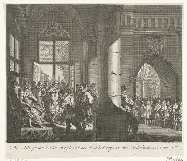 Curator: This engraving from 1732, entitled "Allegorie op het afzetten van de acht overlieden van het Chirurgijnsgilde te Amsterdam," presents quite a scene. It purports to depict the removal of eight overseers from the Amsterdam Surgeons' Guild. Editor: It feels almost theatrical. The linear quality creates a strong sense of depth, leading the eye through these interior and exterior spaces. But there's an undeniable stiffness to the figures; they're so formally posed. Curator: Indeed. The work points to a significant power struggle within the Surgeons’ Guild. The "Theatrum Anatomicum" suggests the context is one of medical authority and public display. See the crowd pressing in—they’re witness to this power shift, making it a spectacle. Editor: I'm intrigued by the juxtaposition of the foreground—this very structured, almost staged, meeting—with the bustling background scene viewed through the archway. The artist seems to have made use of engraving techniques to create detailed spatial layers, that skeleton adds an interesting dark undertone. Curator: The setting is highly symbolic. Note the skeleton and anatomical theater: these reinforce ideas of mortality and bodily knowledge, key components in understanding the social authority of the Surgeons' Guild. Editor: Absolutely. Beyond the social commentary, look how the artist renders fabric through distinct parallel lines to differentiate texture and how it falls on different body types. It’s very consistent, like codified. The figures gain substance and volume because of these lines. Curator: Such elements point to the changing socio-political power structures playing out in Amsterdam at the time, captured here by the artist's critical eye. A visual testament to institutional turmoil. Editor: Precisely! What looked stiff at first glance now feels deliberate. This is less a static image and more a staged scene to examine power, the human body, and texture all through this interplay of line, shape, and spatial balance. It shows us the details matter!