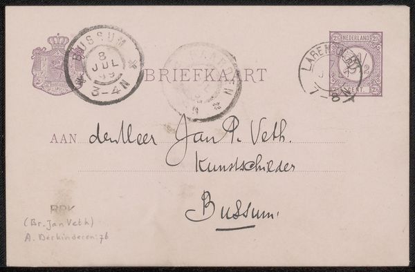 Curator: It's rare to see such intimate correspondence preserved in a museum collection. What catches your eye about Victor Bauffe's "Briefkaart aan Philip Zilcken," likely from 1892? Editor: I find the simplicity striking. It's just ink on paper, a quick note, but it feels very personal and immediate. Almost like a snapshot of a moment in time. What significance do you see in it? Curator: Precisely. We can view this unassuming postcard as a fascinating intersection of social class, artistic networks, and the very act of communication. Consider, who were Bauffe and Zilcken? What did it mean to be an artist navigating fin-de-siècle Europe? Were they connected to other counter-cultural artists resisting colonial projects and other inequities? Editor: I see your point. So the postcard is more than just a note; it's a piece of social history. The address, the "Villa Hélène," perhaps hints at a shared space or artistic commune? Curator: Potentially. We need to consider the power structures embedded within such interactions. Was this an invitation? A debt acknowledgment? Even the postal markings provide clues. Were there other interactions through artistic salons or correspondence that built movements? What kind of exchange was facilitated through written exchanges in the face of a rapidly industrializing world? Editor: It's amazing how a simple postcard can open up so many avenues of inquiry. I hadn't considered all those layers. Curator: Exactly. It challenges the conventional idea of art as only grand statements hanging on gallery walls, helping us re-evaluate how power is expressed and circulated through art production and personal connection. Editor: This has really broadened my understanding. I'll never look at a postcard the same way again. Thank you. Curator: My pleasure! Always remember that art is entangled in our societal values, so by critically looking into these layers, it's a great opportunity to reflect upon where we are today.