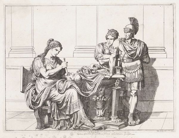 Editor: This is Robert Smirke’s drawing titled "Banquet Scene, with a Roman Soldier Kneeling to a Female Figure Sitting on a Throne," made with ink, watercolor, and coloured pencil. The drama of the moment is emphasized by the kneeling soldier; I am intrigued by how that submissive gesture contrasts with the opulent setting. How do you read this scene through a historical lens? Curator: That's a perceptive observation. Consider how representations of power function within the visual language of the time. Smirke likely drew inspiration from historical accounts or theatrical productions. Think about the narrative implications. Is this act of kneeling one of respect, defeat, supplication? And what’s the message communicated to the audience? Editor: That makes me wonder about the purpose this drawing might have served back then. Was Smirke commenting on Roman authority, or perhaps even British Imperial power through this historical tableau? Curator: Precisely! History painting often reflected contemporary concerns. Ask yourself who this image was intended for and where it might have been displayed. The art market, societal structures and dominant political views deeply affected the production and appreciation of works like these. Do you see any element in the image that explicitly shows Smirke's views? Editor: Perhaps it's the relatively small size and the sketch-like quality. This might suggest it was a preparatory work, meant for a larger project. Also, the theatrics are more on the performance of power. Curator: Exactly. That theatricality speaks volumes. The "Roman" setting gives distance. But consider, too, how audiences of his time might read those power dynamics onto their own social landscape. Editor: It’s fascinating how much a single image can reveal about the social and political context of its time. It changes my appreciation of Smirke's intention for this particular subject. Curator: Indeed. By examining the social role and cultural institutions that framed its creation and reception, we see the past—and perhaps even ourselves—in new light.