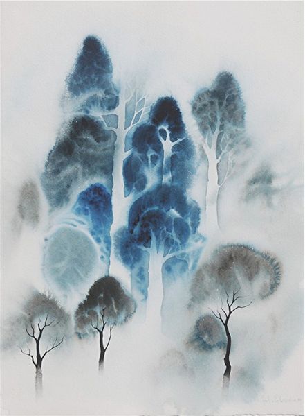 Editor: This drawing is entitled "Autumn Forest." While the date is unknown, it is the work of Eyvind Earle. The image is composed with ink and watercolor washes creating these tall stark trees. It feels sparse, and a little melancholic. What do you see in this piece? Curator: It's evocative, isn’t it? For me, this piece acts as a subtle commentary on environmentalism and our relationship with nature. Consider Earle's other landscapes; he often depicts scenes of untouched wilderness, almost as a form of protest against the encroachment of industrial society. The near-absence of color and delicate washes here seem to emphasize the vulnerability of the forest, as if it’s fading or disappearing. Editor: Fading? That's interesting. So, are you suggesting that the "melancholy" I sensed could be a reflection on ecological loss? Curator: Precisely. The skeletal trees become symbols of a diminished natural world, perhaps inviting the viewer to reflect on the consequences of deforestation and climate change. The few remaining red leaves, concentrated in the upper reaches, can be seen as lingering signs of life struggling to survive. It makes you think about resilience, doesn't it? Editor: Yes, it really does! I hadn't considered that. I was so focused on the aesthetic that I missed the deeper layers. Are you also suggesting this landscape offers an emotional context, rather than just a visual experience? Curator: Exactly! It asks us to consider our place and impact within these vulnerable ecosystems. Earle's forest embodies a crucial intersectional narrative, weaving together aesthetic beauty with a critical commentary on environmental ethics and social responsibility. Editor: That connection makes the work so much richer. I see the painting in an entirely new light. Curator: It’s a powerful reminder that art often invites dialogue between our historical understanding and the urgent conversations of today.