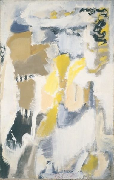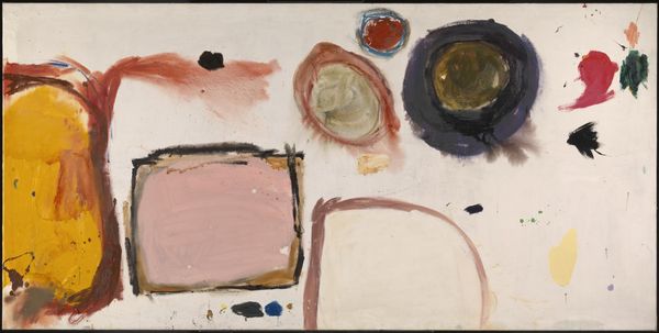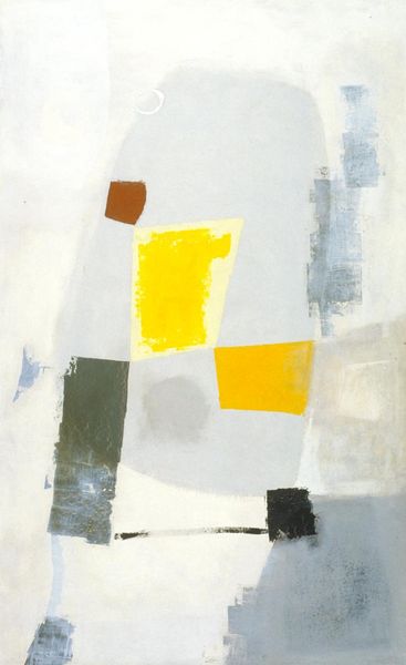 Curator: John Ferren's "Ski," created in 1952, presents us with a compelling example of Abstract Expressionism. It's an acrylic on canvas piece that, from my perspective, speaks volumes about the artistic explorations of that era. What's your initial read? Editor: It strikes me as surprisingly serene. There's an almost meditative quality to the way these shapes hover against the white ground. The palette is muted, even melancholic, and while abstract, these visual elements are very soothing to my eye. Curator: The abstraction allows for diverse readings, especially in the post-war context. The title "Ski," coupled with the dynamic, almost suspended, forms, makes me consider the idea of movement and escape—perhaps a reflection on the fluidity and uncertainty of identity in a rapidly changing world. How do those symbolic elements sit with you? Editor: Symbolically, those shapes read to me as fragments, maybe of memories or half-formed ideas. Note how some have hard edges, while others seem to dissolve. They suggest to me how meaning is built over time through accumulation and erasure. That muted red almost has an archaic quality. Curator: I agree. I would stress Ferren's connections to modernism. We need to understand his place in the legacy of abstraction. He wasn't merely creating aesthetically pleasing forms. "Ski" reflects broader societal shifts. I wonder, do the visual components speak to societal themes as well? Editor: It's possible. I see a through-line here between this canvas and cave paintings, or early cosmologies – fundamental symbols abstracted through time. They speak across periods. This gives the piece its profound, haunting affect. Curator: "Haunting" is the right word. By choosing this level of abstraction, Ferren provides us the chance to actively participate in creating the meaning behind this painting, and perhaps relate it to our own lives. Editor: Yes, and in the end, despite its modernist appearance, this image evokes a primordial landscape within our minds.
