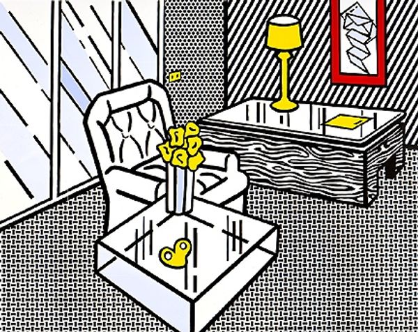 Curator: Oh, look, we’ve got Patrick Caulfield’s “Interior: Morning” here, made in 1971. Such a striking, bold painting, don't you think? Editor: Striking is definitely the word. It's oddly calming but unsettling at the same time. It's as though a Hopper painting has been distilled into geometric abstraction, leaving behind a sort of... existential morning dread? Curator: I see what you mean. Caulfield was fascinated by ordinary, everyday scenes, yet he transformed them into something quite detached and iconic through his signature bold outlines and flat blocks of colour using acrylic paint. The lamp, that grid-like window, it all feels deliberately simplified. Editor: Absolutely. The lamp, isolated and suspended, almost becomes a symbol of unfulfilled expectation. Yellow can represent intellect or warmth, but here, it feels strangely synthetic and drained. The window, with its repeated squares, traps the greyness of the outside, a visual metaphor, perhaps, for routine. Curator: And there's a delightful tension between the reality represented and the artificiality of the representation. Caulfield used these heavy black lines to emphasize the artifice of the image, reminding us that it's just paint on canvas, not a real room, a real window, a real morning. Editor: Yes, it’s almost as if he's deconstructing the very idea of "interiority." We expect comfort, warmth, perhaps sunlight streaming through the window. Instead, we get flat colour and graphic detachment, evoking the post-war anxiety found in Pop Art. The lack of texture further isolates these geometric elements. Each line is confident and unapologetic. Curator: The geometric nature certainly is interesting; everything becomes shapes and patterns. The window, while implying an external world, mainly highlights its internal structure of rectangles. Perhaps, it echoes an isolating environment, a conceptual rather than real space? Editor: Precisely. A room of the mind. And I wonder if the almost clinical reduction speaks to the commodification of the home, the modern dwelling reduced to graphic components... morning transformed from the possibility of a fresh start into yet another repetitive module. It all prompts me to think deeper about home and meaning. Curator: Exactly, it makes one stop and reassess these images that we often overlook in the whirlwind of everyday life. It becomes strangely more meditative, like this very piece we analyzed here.