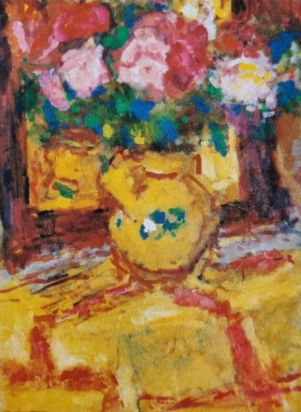 Editor: This is "Still Life with Spring Flowers" by Alexandru Ciucurencu, painted with oil paint, seemingly during his post-impressionist and modernist periods. It feels very intimate and personal. What's your take on this, considering the potential messages it might convey about society? Curator: This piece operates within a framework of domesticity that, for much of art history, has been feminized, right? I'm interested in what it means for a male artist to engage with a traditionally "feminine" subject. Is Ciucurencu reinforcing or subverting those expectations? The lack of specific date is intriguing; where and when would such a piece have the greatest social impact? Editor: That's a really interesting point. I hadn’t considered the gendered aspect of still life. So, the seemingly simple depiction of flowers on a table gains more depth if we look at it from a gendered point of view. Does this influence the colors used, like the greens, reds, and whites, when discussing themes like women's suffrage and reproductive rights? Curator: Exactly! These paintings don't exist in a vacuum. And consider the arrangement: the way the flowers are presented, seemingly casually but also deliberately, tells us something about how the artist views the domestic sphere and its inhabitants. How might this painting be received if it were by a woman, or explicitly addressed ideas like feminism or queer liberation? Editor: That makes me see how the symbolism is not always inherent but relational to both the producer and the audience. I guess it depends a lot on who is looking at it, and from what time period! Curator: Precisely. We, as viewers, are always participating in constructing meaning. It's also an opportunity to question whose stories are being told, and how those stories have been shaped by social norms and expectations. Thinking of it from these angles opens doors for richer art interpretations. Editor: It has definitely opened up the image for me; what seemed a familiar scene feels complex!