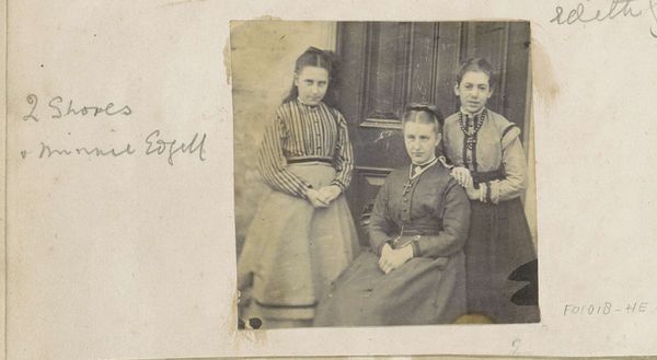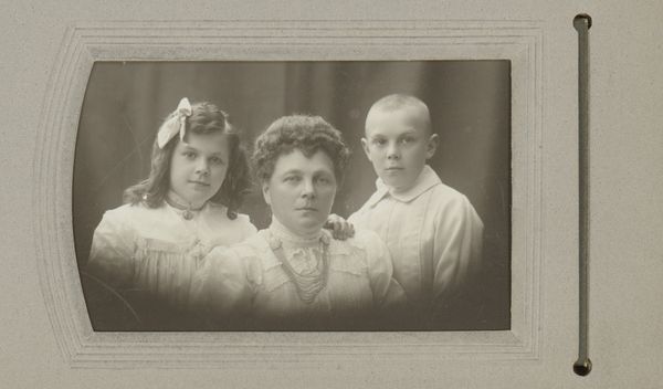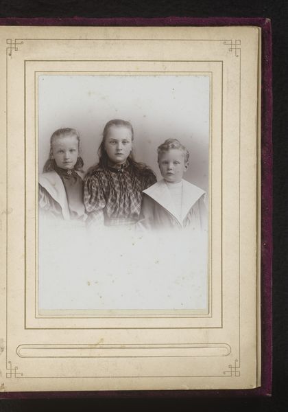 Curator: This is "Portret van een meisje en twee jongens," a photographic portrait by Otto Barkhausen, likely taken sometime between 1850 and 1900. Editor: It’s a striking image. Their solemn expressions are quite powerful and moving, creating an almost unsettling sense of maturity in such young faces. Curator: The clothing does speak to rigid social structures and codes. It seems important to reflect on gender roles and societal expectations placed upon these children during that era, particularly regarding performance and conduct within a family portrait. Editor: Exactly, and it’s difficult to disentangle the aesthetic of historical photography from the socio-political context. The careful composition speaks to the ritual and cost of portraiture at the time. Curator: Right, photographic portraits like this served as visual assertions of class and lineage, solidifying and perpetuating privilege, particularly for white families. Who had the means, who had the power to inscribe themselves into the visual record? Editor: I'm also drawn to the way the image invites assumptions about power dynamics within the family unit. The girl sits centrally with what seems like a position of power, and all three are situated around a book. Do we read literacy and knowledge as a reflection of status, of learning, of self-determination? Curator: That book becomes a symbol of so much—education, religion perhaps, and societal expectation, and also serves to enhance, even authorize, their position within society at large. A white, Western cultural history object. Editor: And even today, these historical artifacts can trigger a cascade of meaning, both conscious and unconscious, especially for those from marginalized communities who’ve been systematically excluded from such portrayals. Curator: Seeing this piece also drives home the point of considering what isn't captured and to understand that every artistic choice made reveals something. Editor: Precisely. It’s through this historical and societal framework that these century-old images transform from simple snapshots to reflections of complex and still-relevant issues of identity, representation, and power.