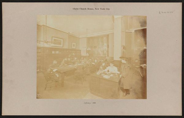 Curator: This photograph, titled "Amphitheater voor het onderwijs in ontleedkunde" or "Amphitheater for instruction in anatomy," was taken around 1902 by Tan Tjie Lan. The image is a gelatin silver print. What's your immediate take on it? Editor: Striking. There's a real sense of staged formality but undercut by the very stark, almost industrial quality of the amphitheater itself. It looks incredibly pragmatic; utilitarian, almost. Curator: Yes, I agree about the striking stillness of the arrangement and appreciate how the tonal range is narrow. The eye navigates methodically around the amphitheater. Its careful calibration makes it almost painterly. What about the classroom setup? Editor: It’s all about production and labor, isn’t it? I see rows of students – they all look very uniform – with the skeletal model positioned like a prop for both a macabre and medical display. Everything screams the infrastructure required to teach. This feels almost colonial; that infrastructure being laid to bring some of that 'western' knowledge to Asia. Curator: Your mention of "colonial" and the uniformity highlights its construction. I would want to investigate what structures of knowledge the photograph reifies through its emphasis on linear perspective and composition. The central framing of the skeletal figure almost echoes the way history painting centralizes its figures within orthogonal arrangements. Editor: Exactly! And how is this “knowledge” delivered, who labors for it? We’re given almost nothing to contextualize it. The people here – where did they source their materials? Who produced the photograph itself? It’s also really interesting to consider the accessibility to the image. Looking at this, it highlights the limitations on material, education and more. Curator: I understand your materialist perspective, its limitations do resonate with your insight, as do the questions you are positing here on a visual field; questions of representation. Thank you. Editor: Thanks. Looking through this colonial-industrial lens gives new perspective to me on art!