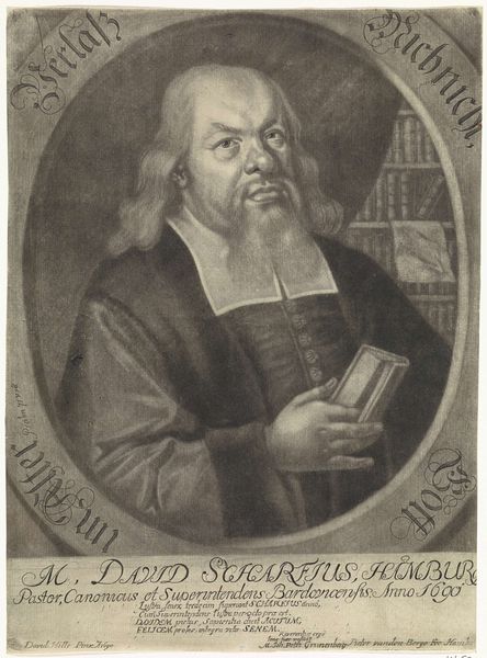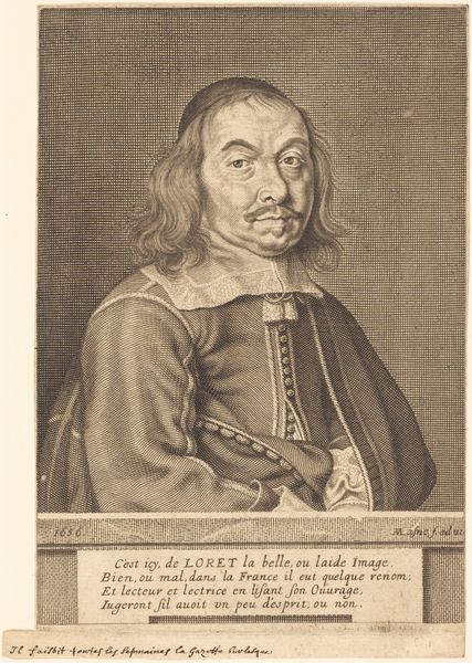Curator: Here, we see an engraving, "Portret van Henrich Freder burgemeester van Danzig," a portrait of Heinrich Freder, the mayor of Danzig, made between 1647 and 1654 by Frans Allen. It depicts Freder in elaborate Baroque style, surrounded by symbols of wealth and status. Editor: My initial feeling is one of contained power. His gaze is direct, and even in this black and white print, there's a sense of gravitas and formality, a sort of steely control radiating from the piece. Curator: Precisely. The image adheres to a visual vocabulary, common in portraits of influential figures during the Baroque era. Consider the use of the coat of arms, as well as the drawn curtains in the background which act as markers of prestige and authority. It creates a world that underscores Freder’s importance. Editor: That's absolutely visible. We should examine, however, how identity and power intertwine with societal context. His gaze can also feel like a challenge, even an imposition—raising issues about class, representation, and the politics embedded in portraiture. His hand gestures also signal towards that potential to influence political dynamics and affairs. Curator: Indeed. This composition serves as a visual script about rank during that specific historical setting. If we analyze its symbolism, his garb represents an elite political class with strict social expectations. Note, though, that his slightly melancholic or contemplative features subtly challenge a purely celebratory understanding. Editor: It's that very tension that provides meaning! The contrast reminds me that people—and political figures—aren't monolithic. Recognizing that complexity is crucial to an insightful examination, especially for leaders situated within a strict social strata. Curator: Yes, I concur completely! This print exemplifies the emotional resonance found in symbols of rank—both a reflection and potential subversion of hierarchical order. Editor: Thinking through its legacy in portraiture, I consider what the continued impact has to offer contemporary reflections. It remains potent in discussions of legacy, recognition, and agency.