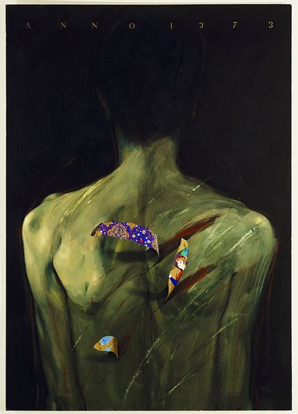 Aydin Aghdashloo painted ‘Falling Angels II’ with oil on canvas. The composition presents a stark juxtaposition: a classically rendered, muscular torso is surmounted by a crudely masked head. This figure is further shadowed by a looming, dark silhouette. The head is obscured by what appears to be a paper bag, upon which a fragment of a miniature painting is adhered, depicting a fallen figure clad in a harlequin costume. The torso, painted in the soft, muted tones of the Renaissance, contrasts sharply with the flat shadow and roughly textured head. This suggests a tension between the ideal and the degraded. The use of collage destabilizes the image's surface, undermining traditional notions of painting. The figure is in a state of fragmentation. Aghdashloo thus creates a semiotic puzzle, challenging viewers to reconcile the conflicting signs of strength, decay, and obscured identity.