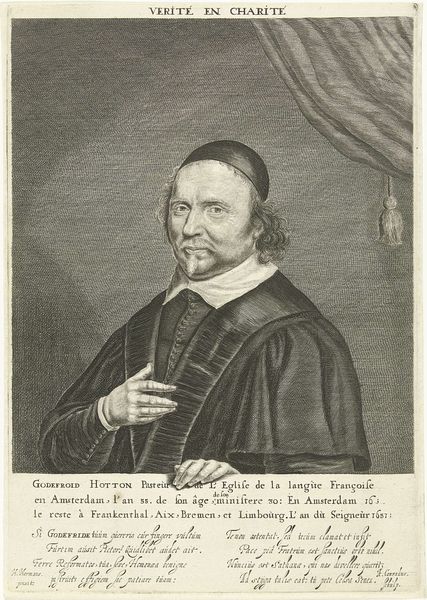 Reinier van Persijn created this portrait of Henricus Dibbets, sometime in the 17th century, using engraving techniques. The composition is structured around the subject's presence, Dibbets, who gazes directly at us with a composed expression. The artist uses contrasting tones to define Dibbets' features and clothing. Light catches the planes of his face, emphasizing the texture of his beard and the folds of his garments. This interplay of light and shadow is essential for creating depth and volume, as it defines form. The formal qualities of the portrait, such as line and tone, underscore the importance of representation in early modern portraiture. The detailed rendering of Dibbets' features and clothing functions as a signifier of his identity and status. The overall design invites us to consider the relationship between appearance and identity, and the artist's skill in capturing both. The work reflects a broader cultural interest in accurately portraying individuals.