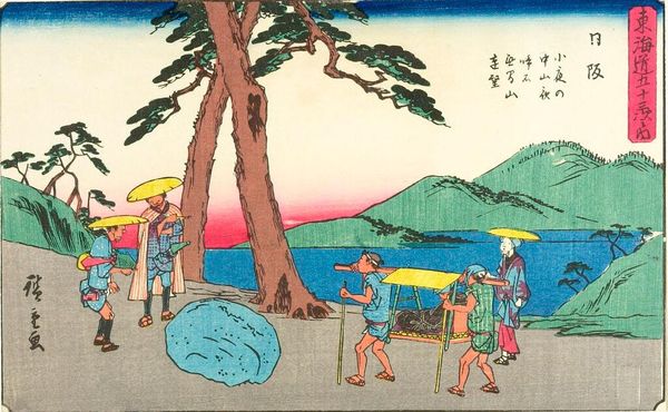 Curator: Here we see "Numazu, Station No. 13," part of Utagawa Hiroshige's "Small Series of the 53 Stations of the Tokaido." Editor: The palette is so calming. I am drawn to the serene lake and the travelers on the road. I want to understand the social and political implications around what these people's lives looked like. Curator: This print offers a glimpse into the economic activities along the Tokaido road, showing workers drying goods near the bustling station, emphasizing the intersection of travel and commerce in Edo-period Japan. Editor: Precisely, it invites us to reflect on the commodification of labor, the power dynamics inherent in travel and trade, and the representation of marginalized bodies within these landscapes. It speaks to the way the human condition has been defined through historical exploitation. Curator: And so, this station becomes not merely a place, but a node in a larger network of power and exchange. Editor: It asks us to consider the untold narratives of those whose labor sustained the very system depicted. Curator: The print offers a multifaceted view of society, doesn't it? Editor: Indeed. It's a reminder that art is inherently political.