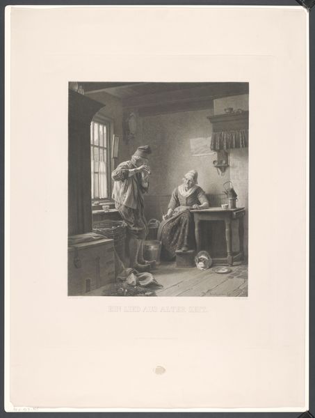 Editor: This etching, "Faust in zijn laboratorium" by Frédéric Boissonnas, dating from before 1896, plunges us into a dimly lit alchemist’s workspace. The detail, rendered in monochrome, is remarkable, yet the overwhelming impression is one of claustrophobia, with so many instruments. What strikes you about it? Curator: Indeed. The dramatic contrast of light and shadow, achieved through skilled etching, immediately commands attention. Consider the formal organization; the composition directs the gaze inward, centering upon Faust. Notice the visual rhythm established by the repetition of circular forms – flasks, globes, even the arched window. This echoes throughout. What function do you see this geometric structure as providing for our viewing experience? Editor: It creates a sort of visual unity, perhaps? It feels like everything is interconnected somehow. Like a cycle, with all those round shapes, giving it a sense of infinity… I wonder, in terms of form, does this repetition evoke the eternal pursuit of knowledge in the Faustian myth? Curator: Precisely! The linear perspective, drawing our eye from the foreground elements to the figure of Faust illuminated by a singular light source, contributes to this very sense of striving. Even the landscape elements that fall within, serve as a formal device which mirrors the inward focus. Consider how all contribute to and reflect the thematic concerns and dramatic unity. Do you feel any tension present in the work's composition? Editor: Yes, now that you mention it. It feels almost staged and self-contained, a manufactured experience of the pursuit. That helps to highlight the isolation that pursuing forbidden knowledge might bring! Thanks. Curator: And by examining these formal devices, the structure of meaning reveals itself. This close looking really brings an additional layer.