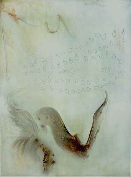 Curator: Looking at Odilon Redon's "Ophelia", it strikes me as ethereal and delicate. There’s a quietness, almost a melancholic serenity to the way the subject is portrayed. Editor: Absolutely. You can almost feel the weight of the paper with that thin wash of watercolor allowing light to penetrate and transform it. The visible weave and its coarse texture contradict this dreamlike and spectral visual, giving the impression of something more substantial. Curator: That is such an interesting juxtaposition of visual softness with palpable objecthood. It makes me think of the Ophelia myth, and of course, Shakespeare’s rendition. The way she, as a female character, is given no space to truly author her life… Editor: Exactly. Think about the conditions for painting in this era—pigment availability, the commercial aspect of brushes. Everything would have contributed to the overall aesthetic in terms of accessibility. But look how those black smudges become botanical, floating next to her portrait like thought bubbles from a tortured character. Curator: Right, and it invites us to think critically about whose suffering is aestheticized for an audience, and at what cost. This portrait certainly evokes Ophelia's tragic ending, a young woman driven to madness and ultimately death because of the social structures oppressing her. Editor: You are seeing them as botanical, but to me, those floating masses resemble more debris and oil slicks; their very blackness seems polluting to the dreamy wash in which she floats. One needs both paper and pigment. So while on the one hand it is about myth and historical context, this painting exists as an object—an accumulation of available materials produced at a very specific time. Curator: Precisely, that tension between materiality and the symbolic is at the heart of so much powerful art. It pushes us to reconcile with difficult histories of representation. Editor: So, although seemingly melancholic and dreamy, I also see a quiet testament to the labour and materials present in this work. Curator: It makes you wonder about Redon's process. Did he actively think through these issues, or was his artwork instead reflective of the time it was made in? Editor: Whether it was intentional or not, that convergence is certainly why Redon continues to fascinate today.