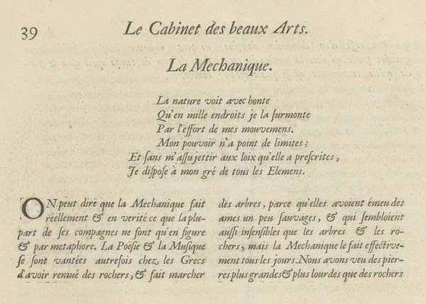 Editor: This is "Tekstblad met verklaring van de prent over Muziek, p. 19," a print from 1695 by Charles Perrault. The typography is quite striking. What captures your attention when you look at this, in terms of the making? Curator: Well, consider the means of production. This isn't just about the beautiful script, but the entire process. This text wasn't casually scribbled; it was meticulously planned and executed as a print, likely using engraving. How many copies were produced, by whom, and for what audience? It moves beyond mere aesthetics to a question of labor and accessibility. What class of people were both the producers, the distributors, and ultimately the audience for such printed material in 1695? Editor: So you are saying, to look beyond just the visual pleasure it brings, and ask questions about its life as an object, how it was made, and distributed? How does focusing on these things change the way we appreciate it? Curator: Precisely! We must remember paper in the 17th century wasn't as easily accessible as it is now. We are really considering value and use. The value placed on musical expression through printed matter becomes evident. It prompts us to consider who had access to such refined commentary, further deepening our understanding of the social and economic context. Editor: I hadn't really thought of it in those terms, more in terms of just what the letters looked like but what you are describing changes my perspective. I suppose analyzing production methods allows us to appreciate it as more than just pretty writing. Curator: Exactly. By dissecting the production, distribution and consumption, it reframes our engagement with this piece, shifting focus from the individual artistry of Perrault towards the cultural context that birthed it.