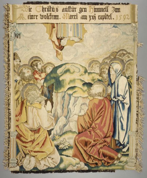 Editor: Here we have "Christ at the Column," made around 1435-1445 by the Delli brothers. It’s currently held at the Metropolitan Museum of Art. This work is striking with its stylized forms and unusual color palette. I’m intrigued by the linear precision juxtaposed with the emotional weight of the subject. What do you see in this piece from a formalist perspective? Curator: Indeed. From a formalist standpoint, let us observe the composition: the verticality of Christ's figure anchored by the column is countered by the kneeling supplicants and the horizontally stretched text. Notice how the Delli brothers employed a restricted palette, primarily linear draughtsmanship with subtle washes. What effect does this have on the viewer's reading of the form? Editor: I see how the lack of vibrant color really focuses attention on the lines themselves, giving it a sense of austerity. It almost feels like a blueprint for a sculpture. Curator: Precisely. The linear quality underscores the geometric structure inherent in the architectural background, drawing our attention to the calculated arrangement of forms within the pictorial space. The interplay of light and shadow, although subdued, accentuates the volume of Christ’s body. It highlights the physicality amidst the otherwise stylized rendition. Are there semiotic readings you find intriguing based on the composition itself? Editor: The scrolls are visually balanced but the text seems illegible. Is their form more important than their textual meaning? Curator: That’s a sharp observation. The illegibility foregrounds the signifier—the visual form of writing—over the signified—the meaning of the text. They are shapes within the broader design, adding visual texture and directing the viewer’s eye. Editor: So it's more about the look than the literal content! This focus on form over content offers a new lens through which to appreciate the piece. Curator: Indeed, understanding how the Delli brothers manipulated line, form, and composition deepens our appreciation beyond the narrative. Editor: I hadn’t considered the shapes and balance as deliberately until now!