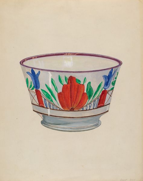 Curator: Here we have John H. Tercuzzi's "Painted Basin," created sometime between 1935 and 1942 using watercolor, coloured pencil, and other drawing media on paper. What's your initial impression? Editor: Utilitarian chic! It's strangely elegant for what is, essentially, a tub. It has a faded glamour, like a Hollywood prop after the golden age. Almost like it contains a story we haven't heard yet. Curator: The image captures a particular moment in design history, showcasing an object from the decorative arts tradition in a Modernist style. We see this in the flat perspective, emphasizing form over realistic depth, and simplifying details to abstract their essence. Editor: Yes, but it’s the ornamentation that gets me. The faux-Baroque swirls, those meticulously rendered floral bouquets. It feels… longingly hopeful, considering it was created during a period marked by economic depression and war. Someone, somewhere, wanted beauty around them. Curator: Precisely. During times of economic hardship, ordinary objects like these are still decorated to provide the promise and idea of better times, and in museums, are used to teach those difficult times through display and conversation. Editor: The composition, the delicate rendering of the metal... There’s something wonderfully domestic about it. It’s an object that wants to be loved, to be filled with something precious - water for the garden or even just holding the scent of petals inside someone's home. A little splash of grace against the gray days, I reckon. Curator: The work embodies how, even amid cultural austerity and institutional anxiety, aesthetic value and cultural history are tied. Even practical objects mirror hopes and cultural priorities. Editor: Well, I'm utterly charmed. This little tub makes me want to arrange wildflowers. Curator: A lovely note to end on; now, let’s explore our next work.
