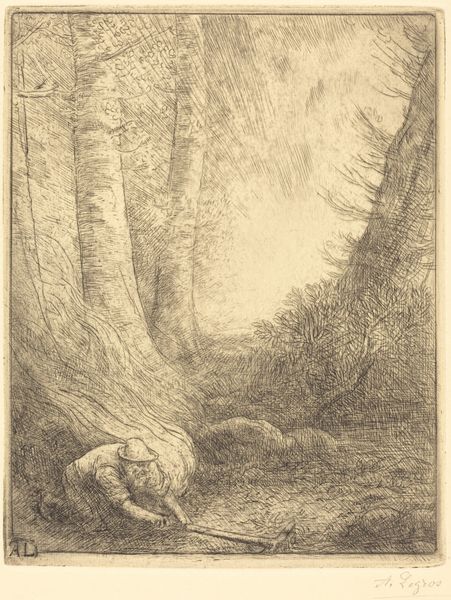 Editor: This is "Vos voor zijn hol in het bos," or "Fox before its hole in the forest," created in 1869 by Karl Bodmer. It's a drawing or print, using etching and pencil. I'm immediately struck by the almost overwhelming detail of the forest; it feels incredibly dense and wild. What are your thoughts? Curator: This print really speaks to the changing relationship between humans and nature in the 19th century. Consider the context: industrialization was rapidly transforming the landscape. Art increasingly reflected a nostalgia for a more "natural" world, untouched by modernity. Does this portrayal of the fox and its den seem romanticized or realistic to you? Editor: I think there's definitely a sense of romanticism. The fox looks almost noble, and the den is presented as a peaceful haven. Was Bodmer making a statement about conservation? Curator: Perhaps, indirectly. Many artists of the time, even if not explicitly advocating for conservation, were drawing attention to the beauty and fragility of natural environments. Prints like these could be widely circulated, shaping public perception and influencing attitudes towards the environment. How might this image affect how people thought about wilderness and wildlife in an increasingly urbanized society? Editor: It probably reinforced the idea that these wild spaces needed protection, or at least appreciation. By showing this tranquil scene, it encourages viewers to value something that's disappearing. Curator: Precisely. And that appreciation, channeled through museums, galleries, and other institutions, could then translate into political will and eventually, perhaps, conservation efforts. The image itself becomes a political act. What have you observed that surprised you? Editor: I never really thought about landscape art as having such direct links to environmental politics and activism. That's a powerful connection. Curator: Indeed. It demonstrates how art acts as a mirror and a catalyst in the historical process. I'm now thinking about the role this image might have played in discussions of conservation efforts.