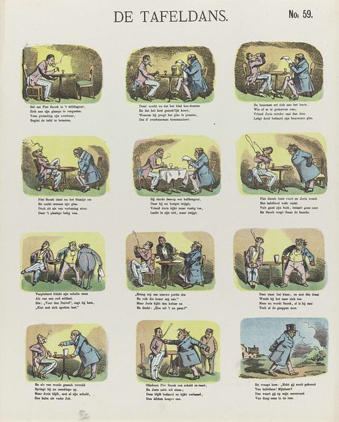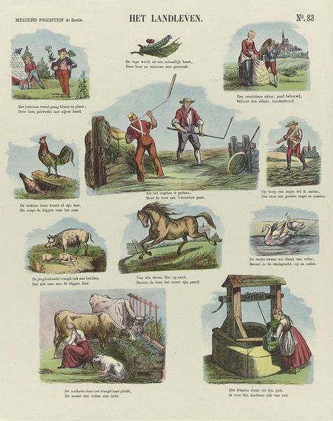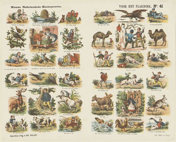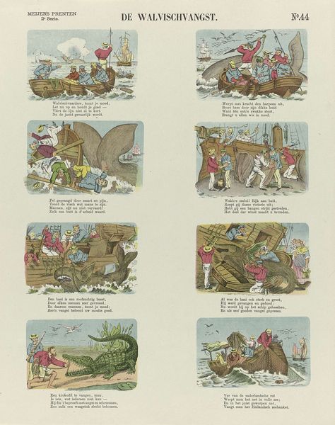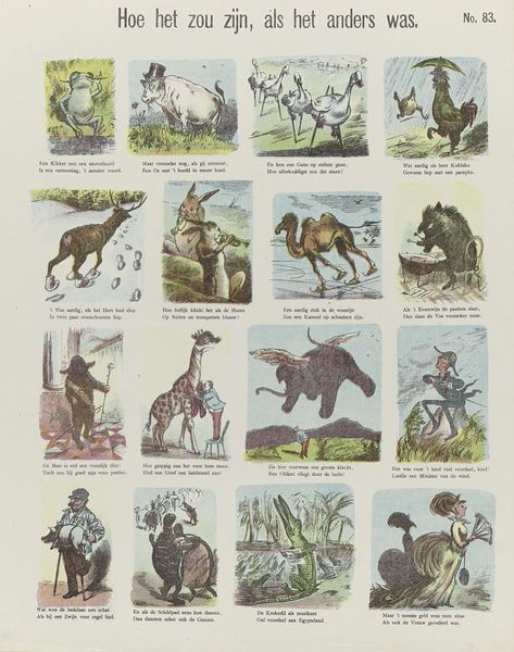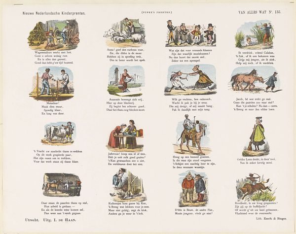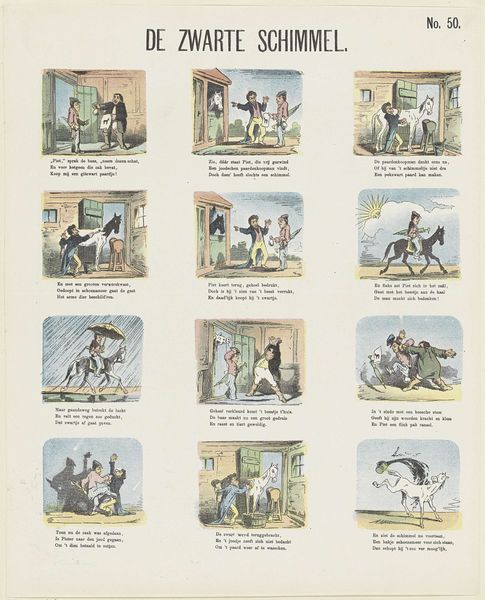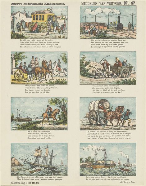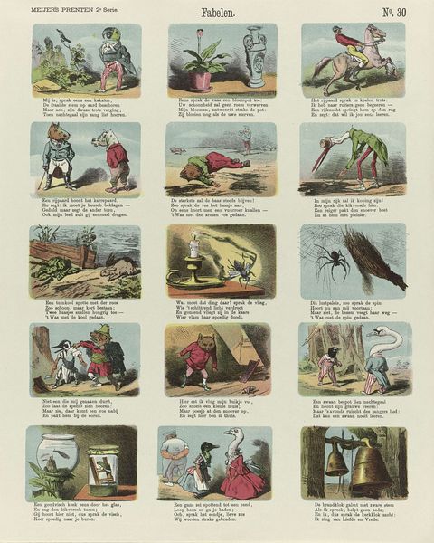 De Ruyter & Meijer created this print, "De slimme poedel Caro," using lithography, a process where an image is drawn on a stone or metal plate with a greasy substance, then printed. The material qualities of lithography allowed for the mass production of images, making art more accessible. This particular print, part of a series, tells a story through sequential images, much like a comic strip. The visual narrative unfolds thanks to the printing press. Considering the social context, the print reflects the rise of consumer culture and mass media. Lithography enabled the creation of affordable visual entertainment for a broad audience, demonstrating the intersection of art, technology, and popular culture. The level of work needed to create the print reflects the demand for accessible art. This print challenges traditional distinctions between fine art and craft by using commercial printing techniques to create an engaging visual narrative.