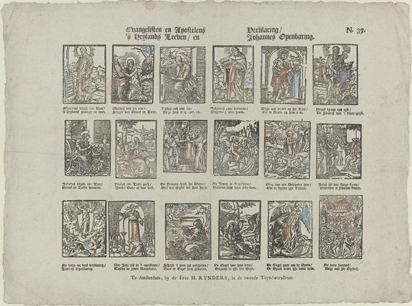 Editor: This is "Taferelen uit het Oude Testament," a print made with engraving techniques by Christoffel van Sichem IV. It looks like a page of sequential scenes from the Old Testament, almost like a religious comic strip. There's a very dense amount of detail in each small scene. How would you interpret these images? Curator: Given the historical context, I see more than mere illustration. These are potent visual summaries crafted during a time of intense religious and social change. Each scene pulls from a well of shared cultural memory. Notice how figures are rendered – simplified, yet instantly recognizable within their narrative roles. What do you think this conscious simplification might signify? Editor: Maybe to make the stories more accessible to a wider audience? So more people could easily recognize the stories. Curator: Exactly. Think about the symbolism employed. Light consistently represents divine presence, darkness often suggests trial or sin. The engraver isn't just depicting events, but using established visual cues to trigger deeper emotional and theological responses. Consider, too, how these images would circulate: Were they intended for private devotion, public instruction, or something else entirely? Editor: It's fascinating how the artist is drawing on such long-standing symbols to connect with viewers, like a visual shorthand. So much meaning packed into these small panels! Curator: Indeed, this print encapsulates the enduring power of visual symbols to convey complex narratives and cultural values across generations. Understanding the historical lens allows you to decipher those coded messages. Editor: I see how the visual language becomes a way to communicate beyond words, a language shared across time and belief. It definitely sheds a new light on how images carried such weight back then and, to some extent, even today.
