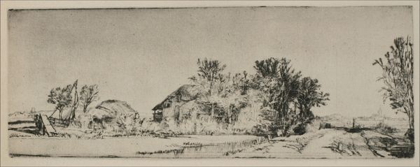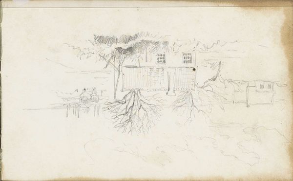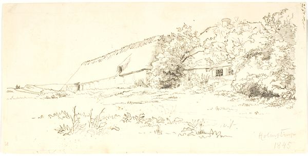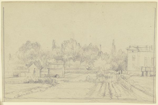 Editor: This drawing, "Achtertuin van Malling Abbey" by Gerrit Postma, was created in 1858 using pencil, ink, and etching. The loose strokes give it a very calm, almost dreamlike quality. What do you see in this piece? Curator: This seemingly simple landscape actually resonates deeply with symbolic meaning when considered in the context of 19th-century social dynamics. Consider the walled garden. What feelings does enclosure evoke? Editor: Safety, perhaps? A sense of protection? Curator: Exactly. But from what? And at what cost? Historically, gardens, especially those attached to religious orders like Malling Abbey, represented a separation from the secular world, a dedicated space for reflection and spiritual growth. Editor: So the Abbey would have represented more than just a building. Curator: Indeed. The visual elements of chickens at the front serve not only to create pictorial interest, but a wider set of values of animal husbandry. The drawing is a vessel carrying specific cultural and psychological symbolism. Are we still building these ‘walled gardens’ today in different forms? Editor: That's fascinating. I hadn't considered how something that appears to be just a landscape drawing could be interpreted in so many ways. Now that I’m thinking about it, maybe we do create walled gardens with our digital devices as echo chambers, and maybe physical buildings, too, like gated communities. Curator: Precisely! Understanding the symbolism allows us to recognize historical continuities in how we perceive security and community, memory and meaning in everyday objects, or animals!