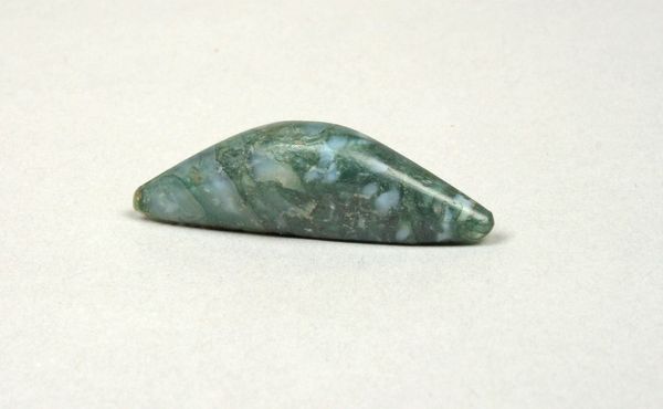 These beads of unknown origin are housed at the Minneapolis Institute of Art. The eye is immediately drawn to the variety of simple shapes and the muted blue-gray tones of the stone against the stark black background. Their placement in space emphasizes a subtle order, suggesting a deliberate arrangement. The formal arrangement and material simplicity can be viewed through the lens of structuralism. Each bead, while unique, shares basic characteristics of form and texture. This prompts us to consider how these elements create meaning, perhaps representing unity or connection across cultures. The beads present a semiotic system; each form a signifier for abstract concepts like identity, status, or spirituality. The beads don’t offer fixed meanings, but instead destabilize our understanding of value and representation across time. The enduring aesthetic value of these beads lies in their capacity to elicit an emotional response through elemental forms and subtle variations. They remind us that art is not just about appearance but about how shapes, colors, and materials function as part of a larger cultural and philosophical discourse.