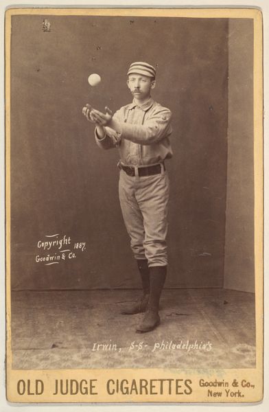 This is "Woods, Left Field, Philadelphia," a photograph from the "Old Judge Cigarettes" series, created around 1887 by Goodwin & Company. It's a commercial image, one of many trading cards included in cigarette packs at the time. These cards offer a fascinating glimpse into the construction of celebrity and masculinity in late 19th-century America. The pose is staged, a carefully constructed image meant to convey athleticism and respectability. The very act of mass producing and distributing these images via tobacco products speaks volumes about the intertwining of commerce, leisure, and identity in this period. Consider how the image participates in a visual culture that largely excludes people of color. The whiteness of the player is not incidental but central to the image's appeal. The visual language reinforces a hierarchy, a subtle yet powerful statement about who belongs and who is celebrated in the realm of professional sports.
