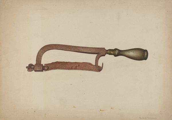 Curator: Let's consider Charles Garjian's "Ladle," dating from around 1939. He employs watercolor and charcoal in its depiction. Editor: My initial impression is one of aged utility. The textures really speak to the wear and tear of repeated use – you can almost smell the soups it stirred. Curator: Absolutely. It goes beyond mere depiction. A humble ladle, but here, it evokes domesticity and ritual. Note the wood grain of the handle and the sheen on the copper, the play of light implying a lived experience, all creating an icon of home. Editor: It's fascinating to think about how Garjian chose to portray this specific object. Was he thinking about craft, domestic labor, or perhaps the means of sustenance? What were his available materials, his relationship to labor and daily life that drove him to memorialize a basic implement of the kitchen? Curator: Considering its date, the shadow of the Great Depression surely hangs over it. A ladle symbolizes not just food, but the very act of providing, a potent symbol in times of scarcity and want. The darkened interior is reminiscent of countless meals prepared. Editor: And look at the twisted wire that holds the ladle; this isn't just a utilitarian object. This piece reveals hand craftsmanship—a sort of artistry elevates it. What were the material limitations of the time, or the aesthetic considerations, that inspired this choice of construction? Curator: It could also hint at deeper symbolism, a vessel that not only holds physical sustenance but also nourishes the soul. Think of the communal act of sharing soup, the warmth it provides. Editor: I see your point about sustenance. However, seeing that twisted support also tells me that the maker understood materials in detail: knowing how copper can be formed. Curator: So, we journey from simple utensil to poignant reflection on home and labor during challenging times. It prompts us to value the familiar objects we tend to overlook. Editor: Yes, seeing the artistry that goes into an everyday object. Garjian calls us to examine material, and to look to the everyday and find creativity inherent in it.