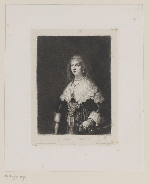 Curator: This engraving, created in 1874 by Léopold Flameng, offers a glimpse into the past through a portrait of Elisabeth van Bourbon. Editor: My first impression is of quiet opulence. There's a stillness, but the details in her gown suggest incredible wealth and probably unbearable corsetry. Curator: Indeed. Flameng, a master of the engraver's art, captures both the grandeur and the constraints of royal life. Consider how the medium itself, the print, allows for wider circulation of her image, shaping public perception. Editor: It's fascinating how the starkness of the engraving emphasizes the textures of the fabric. The ruff around her neck looks both magnificent and strangely confining, like a gilded cage. What was the role of images like this back then? Curator: Prints like these democratized portraiture. While an original painting remained in the hands of the elite, engravings allowed a broader audience to access and consume images of power and status, reinforcing social hierarchies, but also offering a semblance of access. Editor: So, it's propaganda, in a way? Controlled messaging, perfectly coiffed and carefully disseminated? I wonder what her true personality was like, beyond the surface of royal obligation. I feel like, through the medium, some information is lost but some other gained. Curator: It's a valid observation. Flameng's work served to construct and reinforce a specific image, a visual representation of power for consumption. We cannot recover entirely the personality of the represented lady, but we gain insight into the social construction of her role. Editor: The beauty of art is how it reveals more than it intends. I find myself drawn to the subtle defiance I perceive in her eyes. Or maybe it's the long hours, forced in position, just to make an ideal portrayal? In any case, this "Portret van Elisabeth van Bourbon" speaks volumes beyond its lines. Curator: A fine way to summarize our conversation on an important historical piece of art. Thank you!