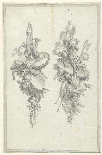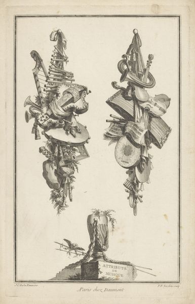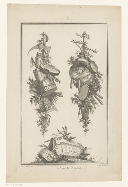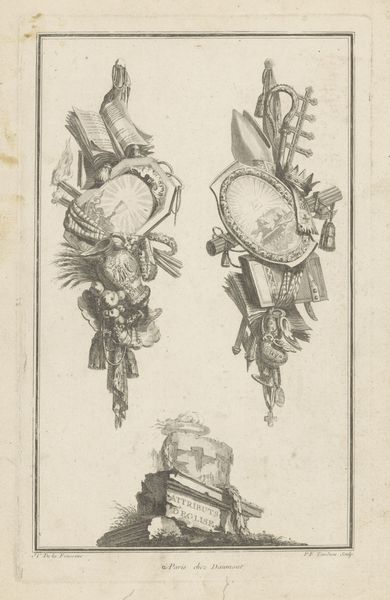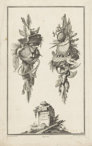 Editor: So, here we have "Trophies with Fish and Ray" created in 1771 by Etienne Fessard. It’s an engraving, currently held at the Rijksmuseum. My initial reaction is how meticulously rendered these arrangements of fishing paraphernalia are, but what's striking is that they look almost like bizarre monuments. What do you make of it? Curator: It’s interesting you mention monuments. Think about the historical context. The late 18th century saw a rise in interest in scientific classification and natural history. This print, like many others, participated in that discourse. Consider how Fessard is essentially cataloging the ‘spoils’ of fishing. Editor: Like a record of maritime bounty? Curator: Precisely. And remember the cultural significance of fishing at the time. It wasn't just sustenance, it was deeply intertwined with trade, colonial expansion, and national identity, particularly for a seafaring nation. The imagery becomes a sort of nationalistic trophy, even a claim to maritime dominance. These detailed engravings were distributed, weren’t they? What public role would this art play? Editor: I see, they would probably be seen by collectors, or displayed in public places... reinforcing that connection between national pride and natural resources. The detail almost elevates fish into prized possessions. Curator: Exactly! Consider, also, how this ‘trophy’ subverts the traditional idea of military victory, and reframes it within the context of natural resource exploitation and its role in the broader socio-economic fabric. It pushes us to consider what society chooses to valorize and how these values are reflected through art. Editor: This engraving isn’t just a still life. It’s a statement about power, resources, and how a nation defines itself. I never would have thought of it that way just looking at the details of the engraving itself! Curator: Exactly! Seeing beyond the surface representation to the deeper cultural meanings really unlocks so much, doesn't it?
