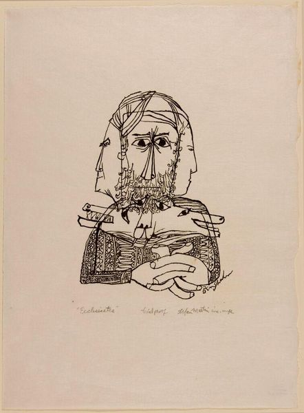 This illustration to "Bandello" was made by Imre Reiner, probably around 1947, and it's a print, likely a woodcut or etching. Look at how the lines swarm and cluster to create tone and form. It's like he's wrestling with the image, trying to pin it down. The figure’s face is so frontal, so insistent, but the marks are restless. See how they dig in, creating a real sense of texture, of the physical stuff of the print? There's a tension between the precision of the lines and the raw, almost chaotic energy they convey. The lines around the eyes are particularly striking, like deep wrinkles or scars, hinting at a life lived hard. This reminds me a little of some of the expressionist printmakers, like Kirchner or Heckel, who were also grappling with ways to convey intense emotion through a very physical process. Art’s this ongoing conversation, right? Reiner’s adding his own voice, his own way of seeing and feeling the world. And it's not about answers, it's about the questions.