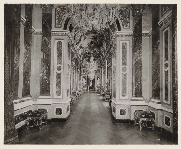 Curator: We're looking at an albumen print by Étienne Neurdein, taken sometime between 1870 and 1900. The work is titled "Interieur van het Monte Carlo Casino: de Salle de Trente et Quarante," which translates to "Interior of the Monte Carlo Casino: the Thirty and Forty Room." Editor: What strikes me immediately is the palpable emptiness and melancholic stillness despite all the opulent detailing. It is a silent record of what would have been an incredibly energetic and noisy space. Curator: Precisely. Neurdein's photographic technique really captures the density of detail here—the ornamentation of the ceiling, the patterns on the wall. I'm fascinated by how the contrasting dark tables and the geometric parquet flooring pull the viewer's eye through the space. It's a meticulously constructed composition, using orthogonal lines for maximum impact. Editor: I see echoes of earlier eras in those decorations: hints of ancient Greek figures worked into the rococo style. Perhaps the artist hints at fate by mixing these older traditions with new money? Then there's the placement of that grand clock—a stern reminder of time running out for those within. Curator: Yes, the clock. Note its size relative to the human scale implied by the chairs and tables, lending the room a subtly surreal atmosphere. And observe how Neurdein skillfully uses light and shadow, almost like an abstract study playing with forms and values in gray. Editor: It does possess a stark contrast between the promise of leisure and wealth and the quiet dread such spaces can evoke, though! One sees traces of power, fortune, and games of chance intertwined within that architecture, which amplifies our present day distance from such themes. Curator: In essence, it’s the emptiness that does the work here. What is usually brimming is a shell, stripped. A powerful play of absences. Editor: Exactly. Neurdein gifts us not just an interior, but a moment suspended in time, filled with implied stories of gain and loss that continue to resonate.